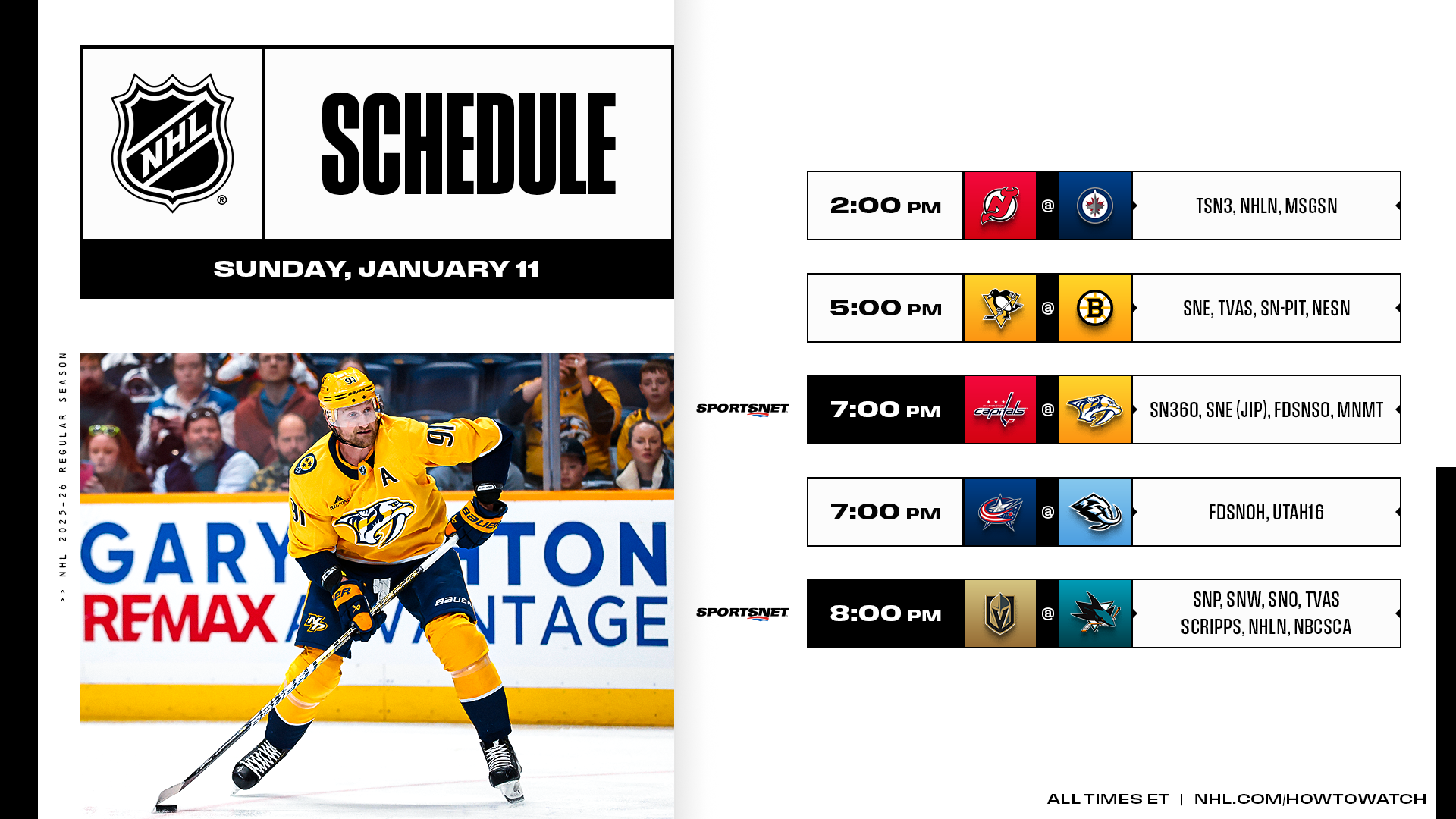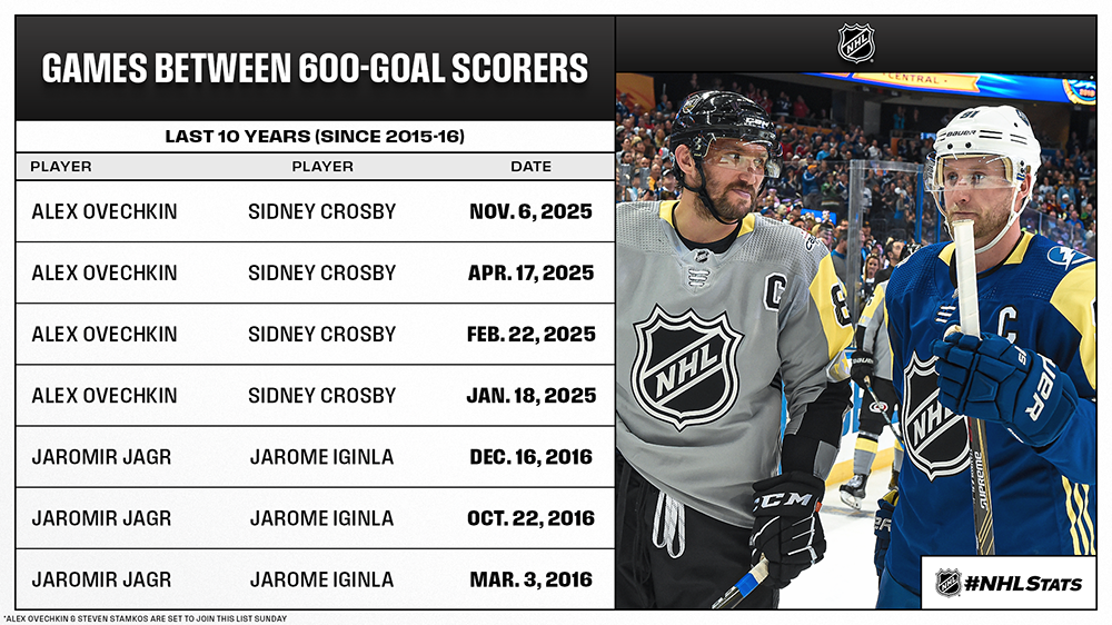 * Sunday’s five-game slate is highlighted by a Sportsnet 360 showdown between Alex Ovechkin and Steven Stamkos, who will become the third set of 600-goal scorers to go head-to-head over the last 10 years.