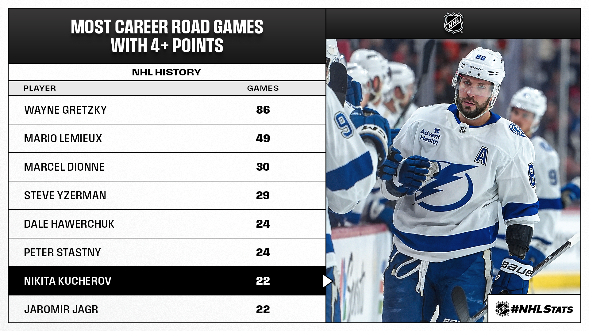 * Kucherov, the third active player and 10th overall since 1992-93 with multiple points in eight straight games, registered his 36th career four-point game – the third most among active players behind Connor McDavid (45) and Sidney Crosby (43). Saturday also marked the 22nd time the Lightning forward has collected four points in a road game – a total he also reached in Tampa Bay’s last outing as a visitor (1-4—5 on Jan. 3).