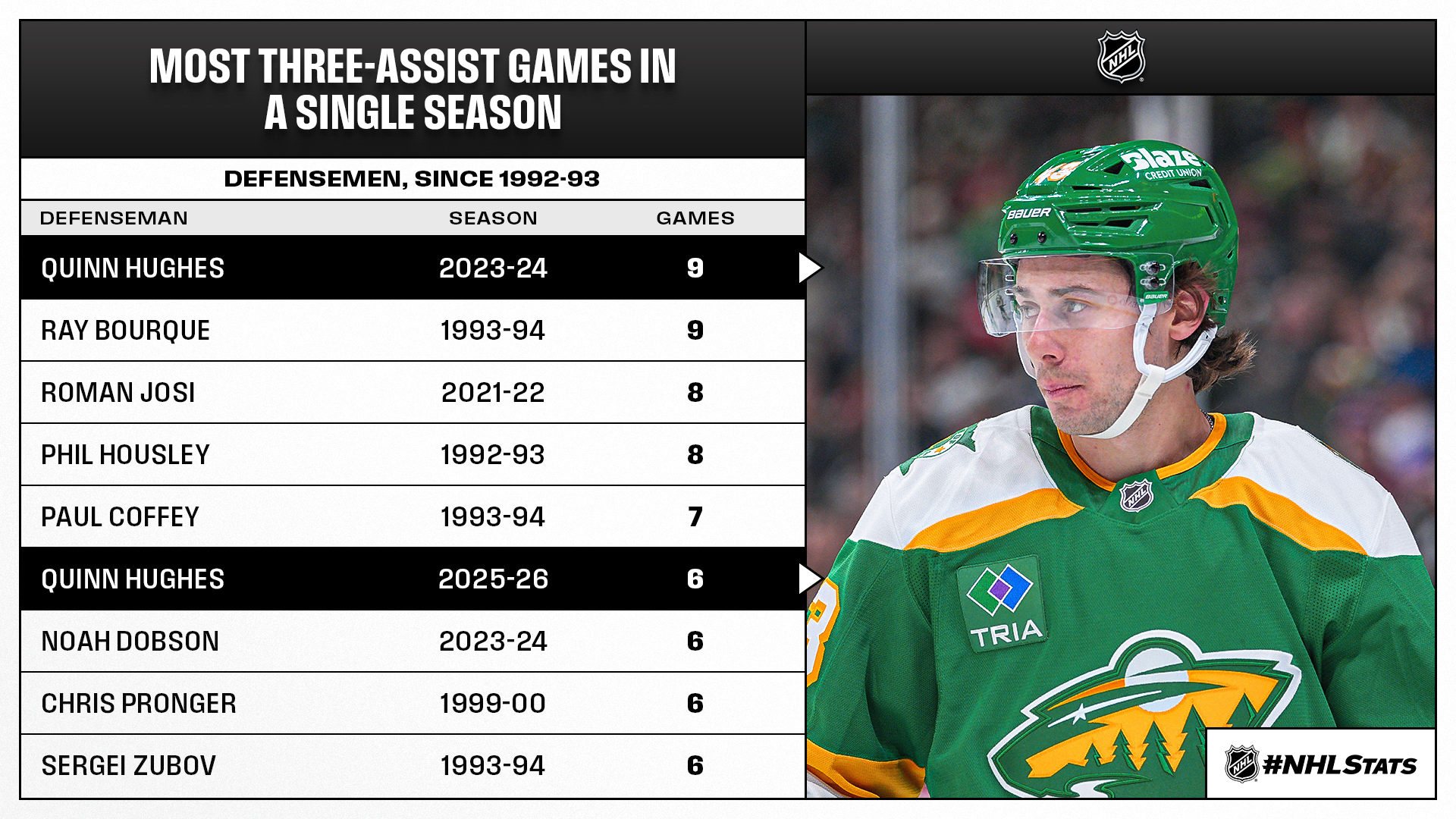 * Hughes, one of eight defensemen since 1992-93 to record six three-assist outings in a single season (also 9 in 2023-24), recorded his 29th career three-assist game and tied Borje Salming and Larry Murphy for the ninth most by a blueliner in NHL history.