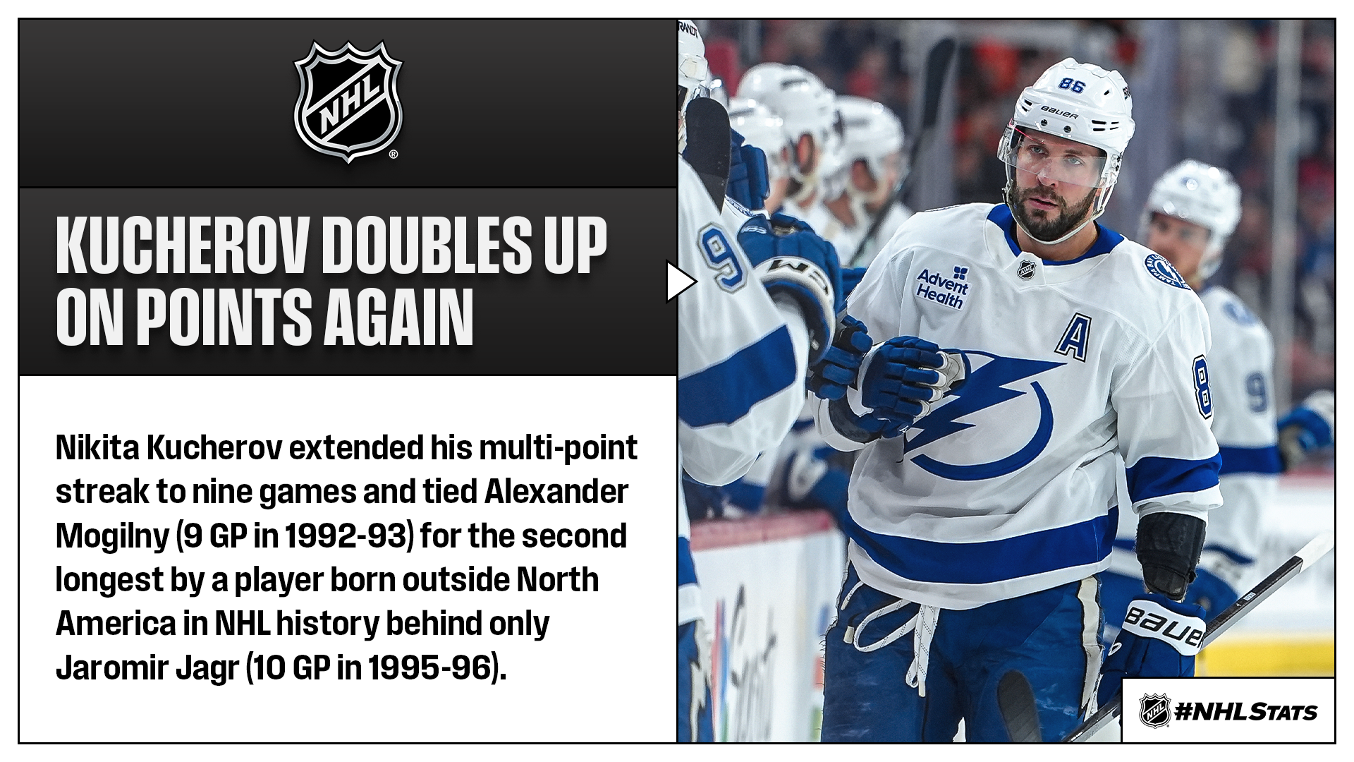 * Kucherov extended his multi-point streak to nine games (10-14—24) and tied former teammate Steven Stamkos (9 GP in 2021-22) for the longest among all active players. Additionally, Kucherov recorded his 12th career 10-game point streak overall and moved into a tie with Peter Stastny for the most in NHL history by a player born outside of North America.
