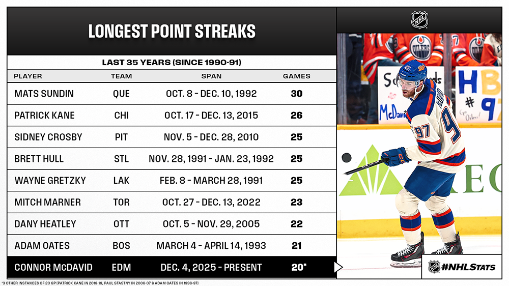 * Connor McDavid (0-2—2) celebrated his 29th birthday by extending his career-high point streak to 20 games, one of a dozen runs of that length over the last 35 years (since 1990-91). McDavid became the third player in franchise history with a point streak of 20 or more contests, following Wayne Gretzky (5x; longest: 51 GP from Oct. 5, 1983 – Jan. 27, 1984) and Paul Coffey (28 GP from Nov. 27, 1985 – Jan. 25, 1986).-13104015.png)
