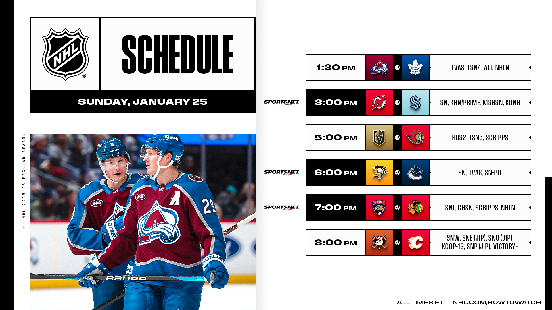 NHL Network and Sportsnet will carry much of the action on the last Sunday of January, starting with a star-studded clash in Toronto where Nathan MacKinnon (COL; Team Canada) and Auston Matthews (TOR; Team USA) will go toe-to-toe for the 18th time. Other notables on Sunday’s slate include Mark Stone (Team Canada) aiming to set a new Golden Knights benchmark (and extend another) when he visits Brady Tkachuk (Team USA) and the Senators; Sidney Crosby (Team Canada) heading back to the site of his “Golden Goal” in 2010; Jackson LaCombe, the newest member of Team USA, will try to help the Ducks to their second seven-game winning streak of the season.