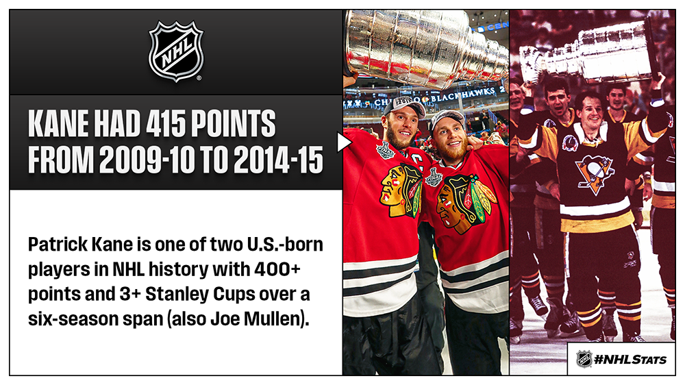 Patrick Kane had an assist against longtime teammate Jonathan Toews and needs one point to tie Mike Modano for the most by a U.S.-born player in NHL history.