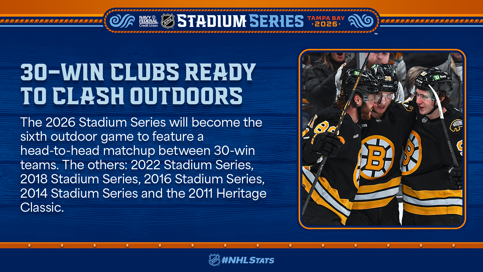 With just four days remaining before the 2026 Navy Federal Credit Union NHL Stadium Series, the Bruins (31-20-3, 65 points) joined their outdoor opponent by continuing their string of success with an eighth straight home win – thanks to David Pastrnak’s goal 13 seconds into overtime – and have one game remaining (Jan. 28 vs. PHI) before clashing with the Lighting at Raymond James Stadium; Tampa Bay – 6-0-0 in its past six home games – also has one contest remaining before the event (Jan. 29 vs. WPG).