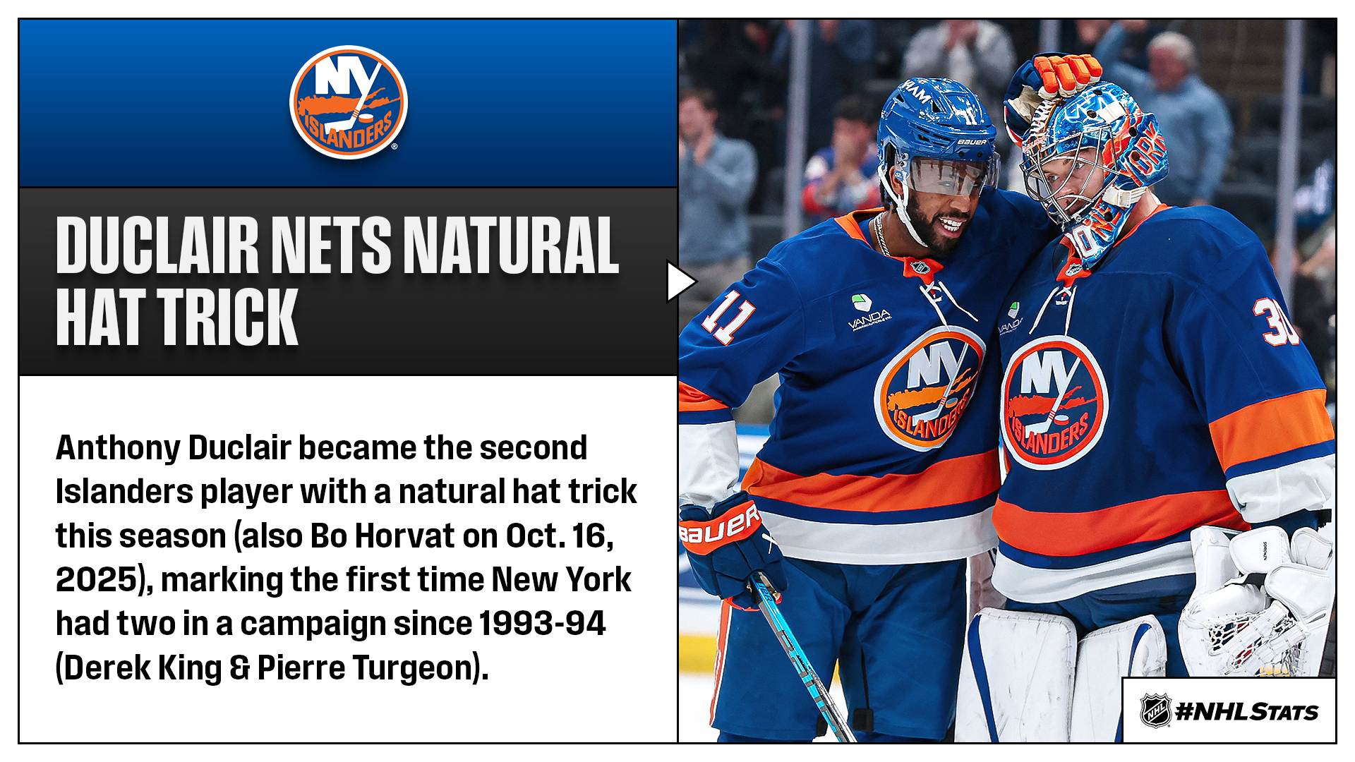 Anthony Duclair (3-2—5) tallied three straight times to record his fourth NHL hat trick (also Dec. 14, 2019, Nov. 18, 2017 & Oct. 14, 2015) and concluded the contest with a career-high five points as the Islanders scored nine goals in a game for the first time since Feb. 11, 2011 (9-3 W vs. PIT) while matching their franchise mark for largest margin of victory in a shutout win. Ilya Sorokin made 44 saves to record his 26th career shutout and pass Glenn Resch (25) for the most in club history.