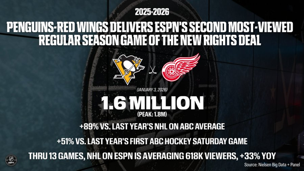* Season’s first ABC Hockey Saturday game delivered 1.6 million viewers