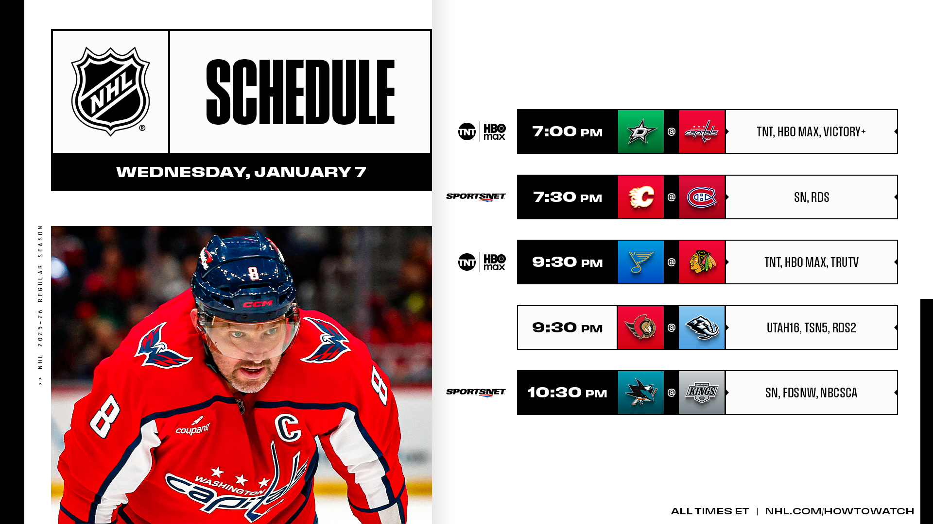 A five-game Wednesday features a two-pack on Sportsnet, beginning with a clash between the Canadiens and Flames, as well as a doubleheader on TNT and HBO Max that pits the Stars against the Capitals and the Blues against the Blackhawks.