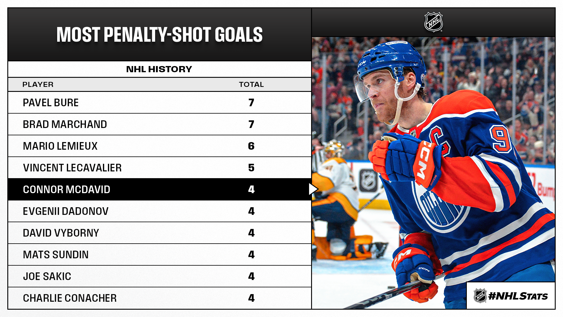 * Team Canada’s Connor McDavid extended his point streak to 16 games – tied for the third-longest of his career – with a hat trick performance that included his fourth career penalty-shot goal. McDavid (14) passed Mark Messier (13) for the fourth-most hat tricks in Oilers history and boosted his goal total during this 16-game stretch to 17, which is now the most in any of his point streaks.