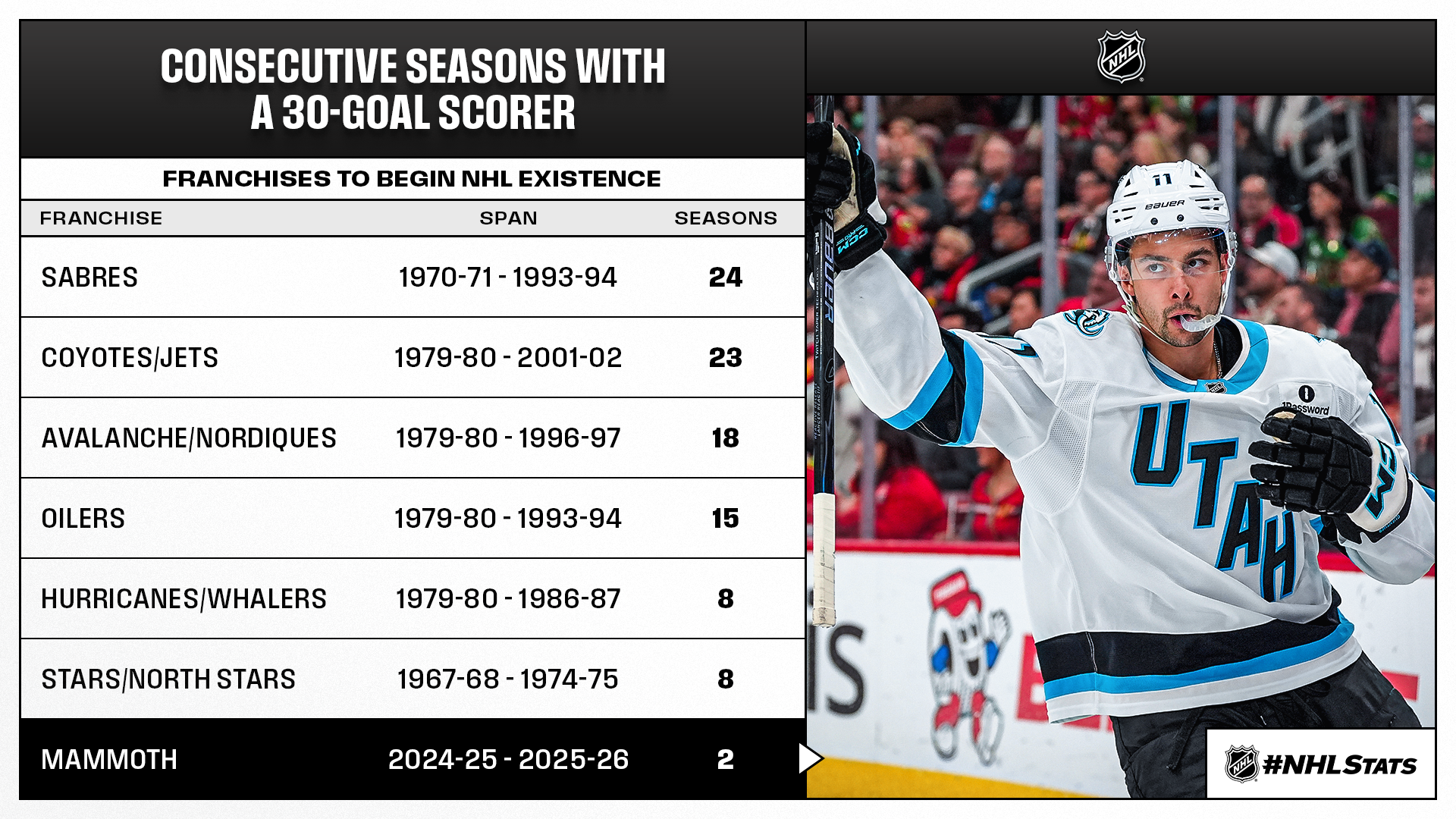 Dylan Guenther’s 30th goal of the season was one of two Mammoth tallies at United Center as Utah (34-25-5, 73 points) salvaged a point against Chicago and opened up a six-point cushion on idle Seattle (29-24-9, 67 points) for the first Wild Card position in the Western Conference. Guenther, who hopes to bring the Stanley Cup Playoffs to the NHL’s newest franchise for the first time, became the Mammoth’s second 30-goal scorer in as many seasons to start their NHL tenure (Clayton Keller: 30 in 2024-25). Click here for more storylines from the Monday edition of #NHLStats: Live Updates.