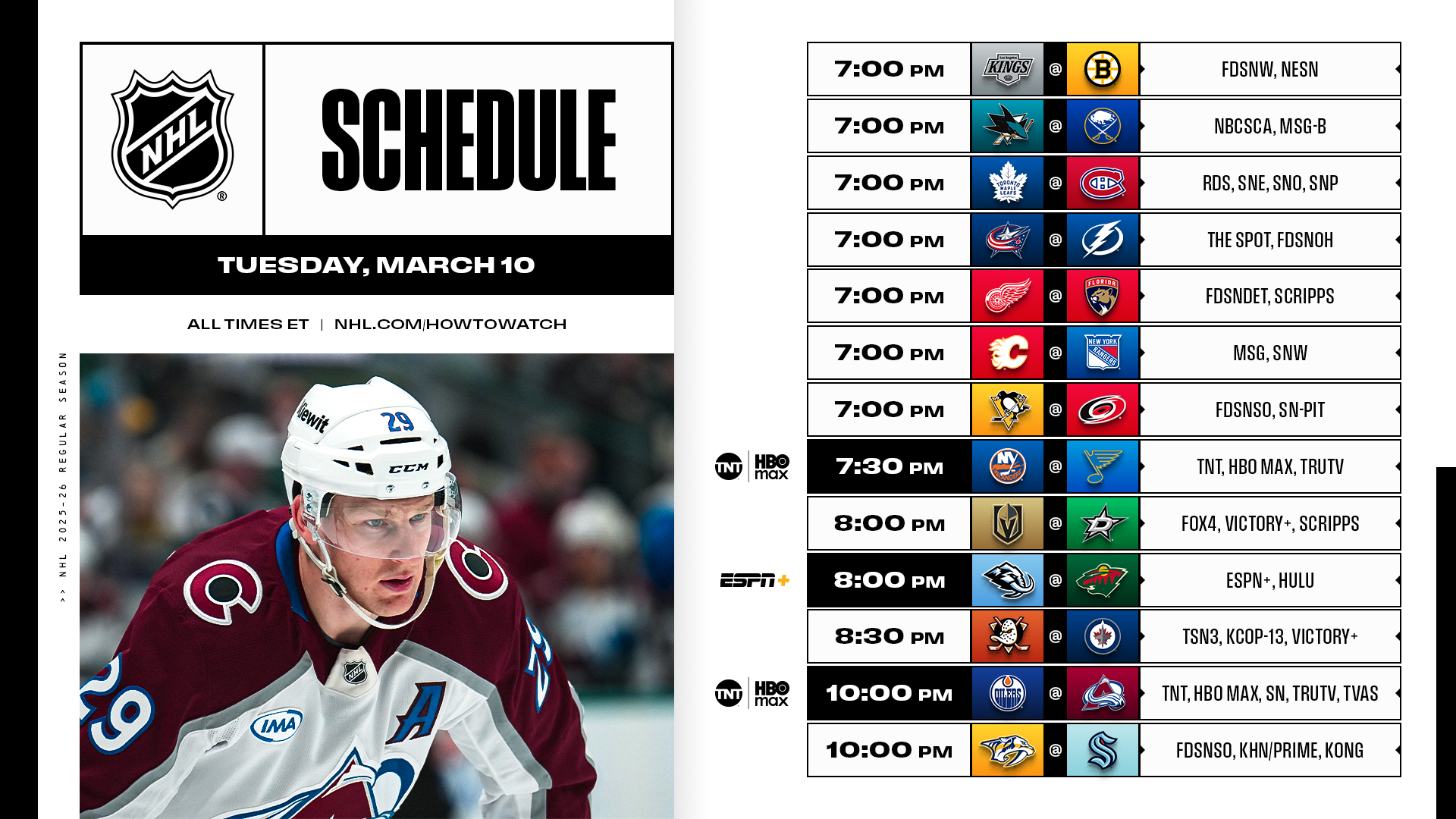 A showdown between the NHL’s top two scorers highlights a 13-game slate when Connor McDavid (35-73—108 in 64 GP) and the Oilers visit Nathan MacKinnon (43-61—104 in 61 GP) and the Avalanche on national broadcasts in the U.S. (TNT, HBO MAX, truTV) and Canada (Sportsnet, TVA Sports). The schedule also includes Islanders deadline addition Brayden Schenn making his return to St. Louis (TNT, HBO MAX, truTV) as well as the Atlantic Division-leading Sabres looking to extend their winning streak to eight games.