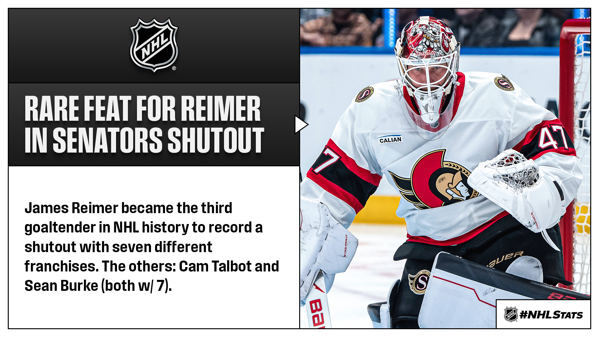 James Reimer turned aside all 16 shots he faced as the Senators (32-22-9, 73 points) won their third straight game, improved to 9-1-2 in their past 12 contests and moved within three points of the idle Bruins (35-22-6, 76 points) for the second Wild Card spot in the Eastern Conference. Ottawa is the seventh franchise the 37-year-old has posted a shutout with, alongside the Maple Leafs, Sharks, Panthers, Hurricanes, Red Wings and Sabres.
