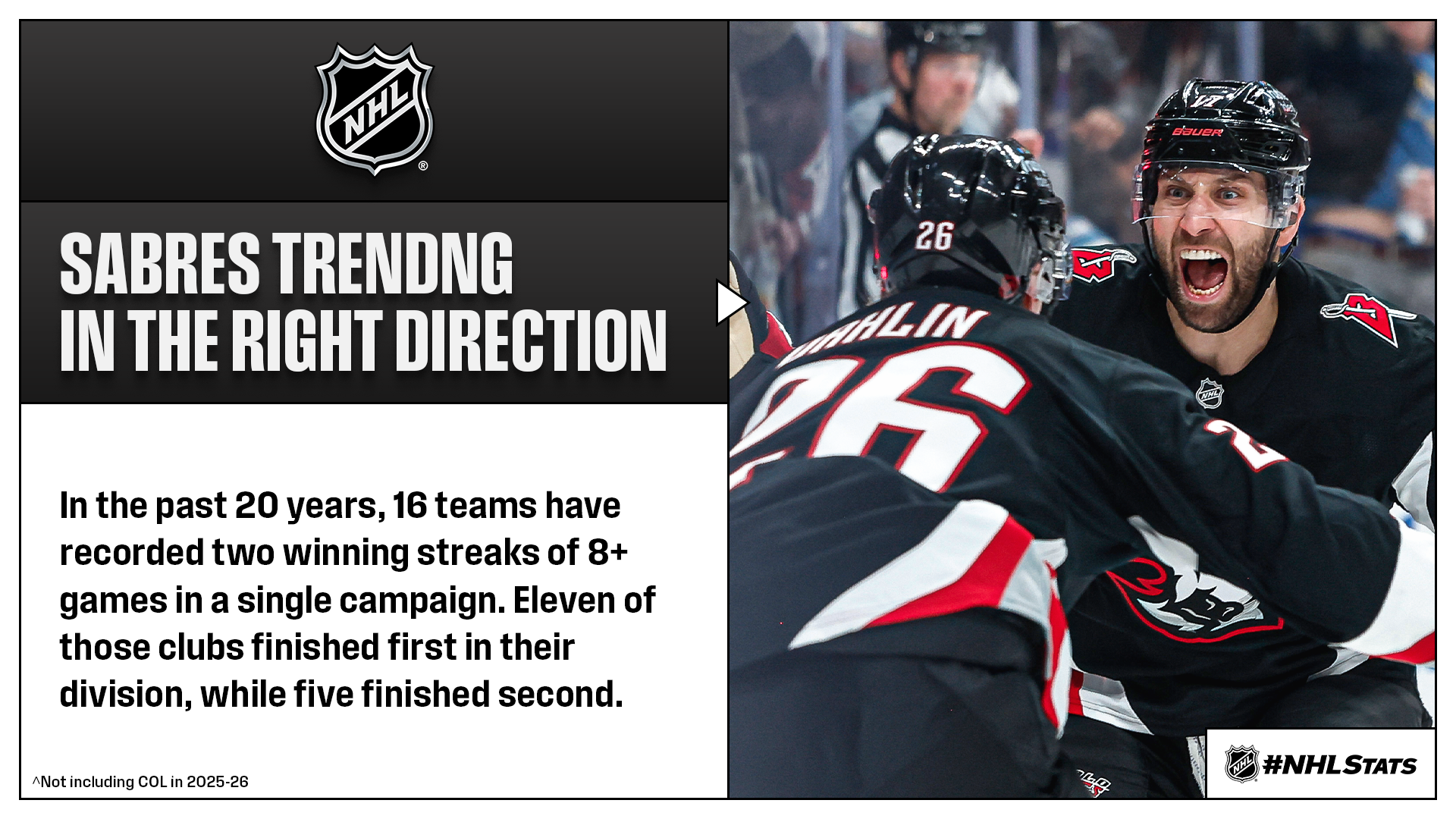 * The Sabres, who overtook the Lightning for top spot in the Atlantic following their 15-goal thriller Sunday, occupy first place in their division at this stage of a season or later for the first time since the conclusion of the 2009-10 campaign. Buffalo owns the NHL’s longest active winning streak at seven games and can record multiple eight-game runs in the same season for the first time in franchise history (also 10 GP from Dec. 9-31, 2025).