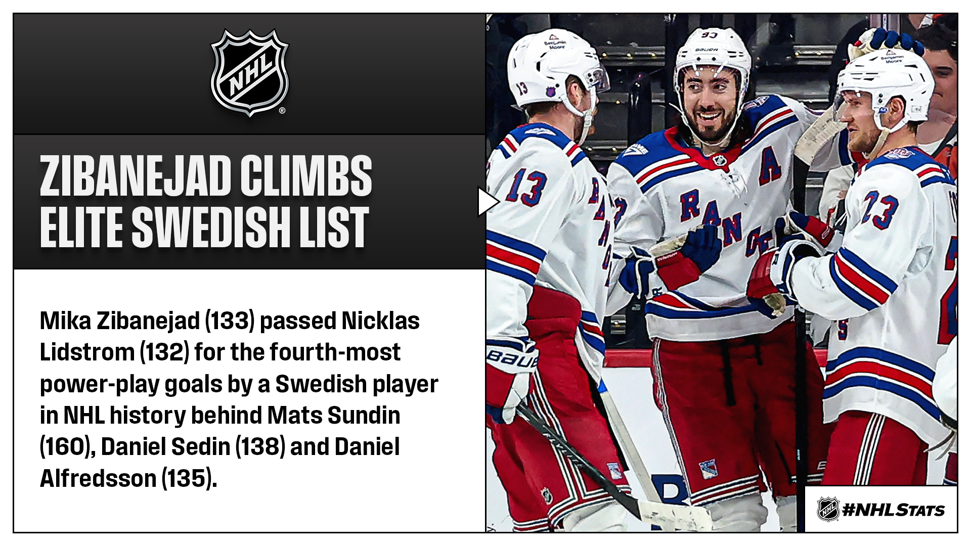* Zibanejad climbed several all-time Rangers lists with his three-point performance: passed James Patrick (237)for the third-most power-play points in New York history, passed Ron Greschner (300) for the seventh-most road points in franchise history and tied Chris Kreider (41) for the seventh-most multi-goal games in Rangers history. The victory also marked Igor Shesterkin’s fifth career 20-win season, which tied John Vanbiesbrouck for the fifth most in franchise history, behind Henrik Lundqvist (13), Mike Richter (10), Eddie Giacomin (8) and Gump Worsley (7).