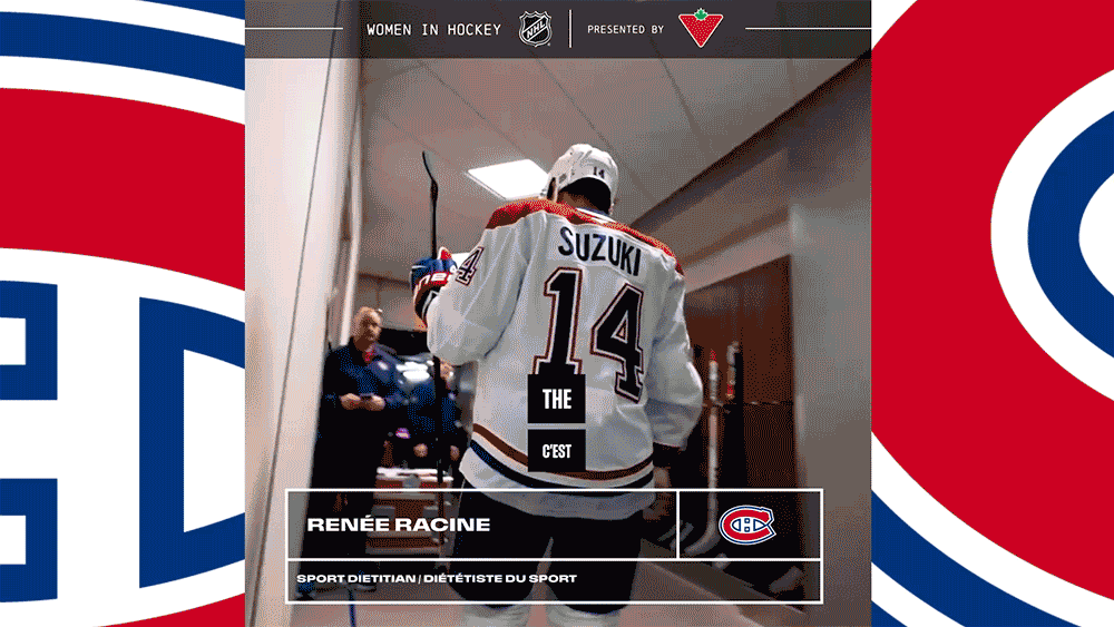 * Renée Racine is the Canadiens’ sports dietitian and will be highlighted ahead of Montreal’s game as part of the Women in Hockey presented by Canadian Tire spotlight. Racine works with players to optimize their nutrition for performance and recovery – she supports individual and team needs through menus for the rink, hotels and flights.