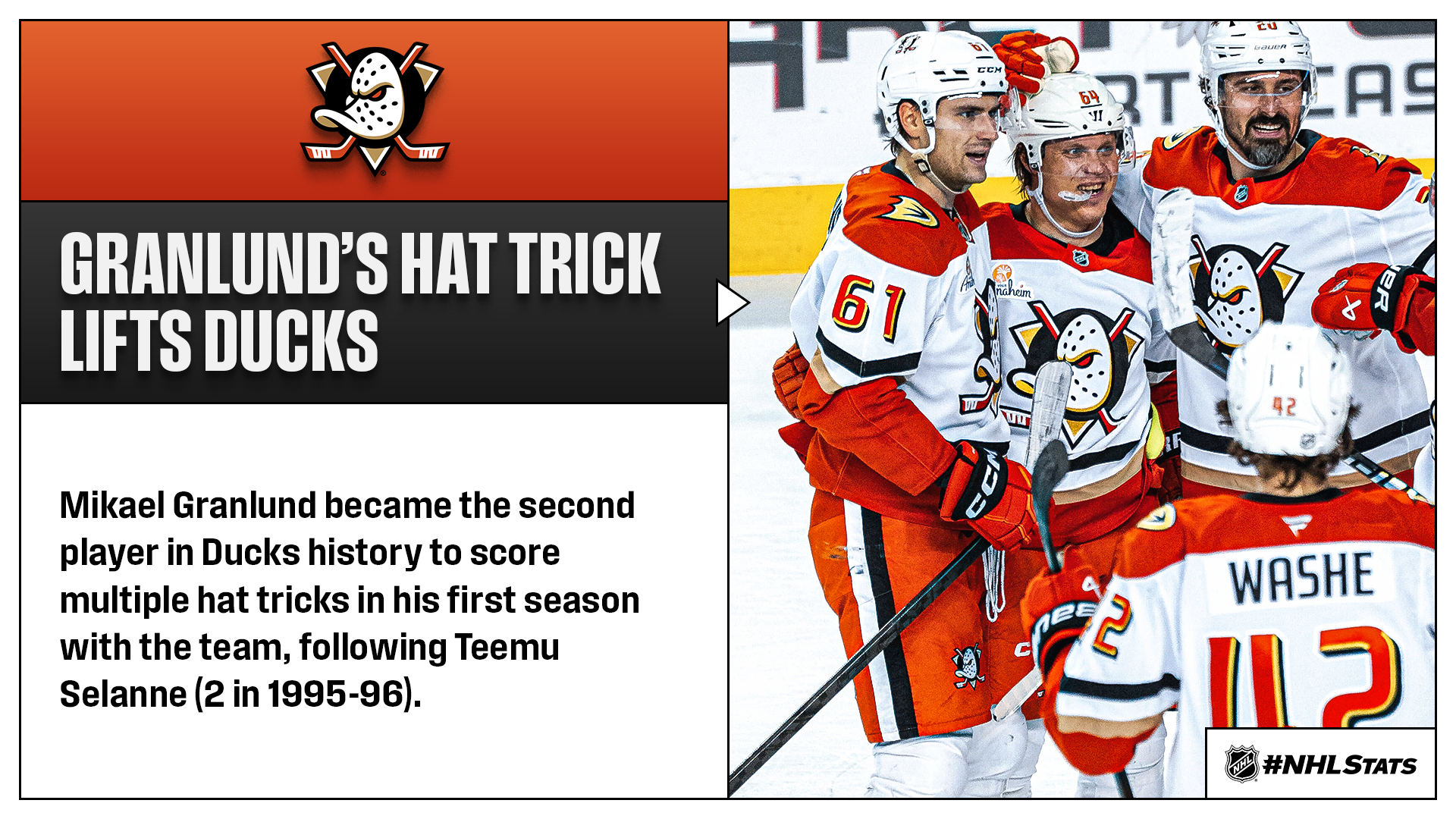 * Granlund tied Peter Douris (4:59 on Nov. 17, 1995) for the latest overtime goal in Ducks history and became the sixth Anaheim player to cap a hat trick with an extra-time tally. The others are Beckett Sennecke (Jan. 25, 2026), Troy Terry (Nov. 1, 2023), Cam Fowler (Nov. 4, 2018), Hampus Lindholm (Dec. 21, 2017) and Lubomir Visnovsky (March 4, 2011).