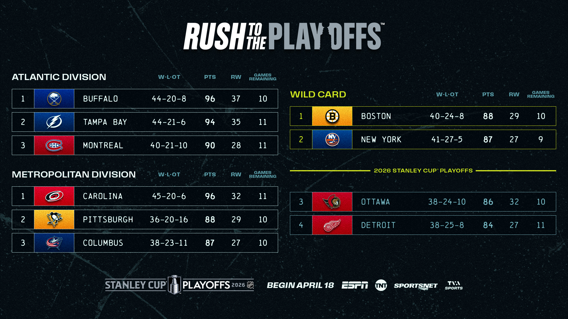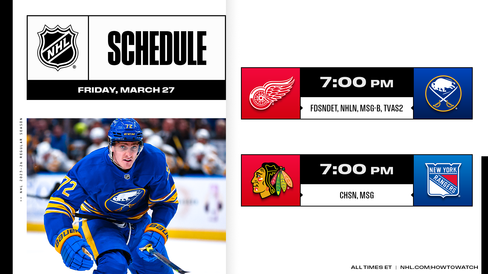 The Atlantic Division-leading Sabres (44-20-8, 96 points) welcome the Red Wings (38-25-8, 84 points) to KeyBank Center as the latter looks to climb back into the Eastern Conference playoff picture after spending 123 game days in that position in 2025-26. Buffalo and Detroit, which last made the Stanley Cup Playoffs in 2010-11 and 2015-16, could meet in the First Round should the Red Wings overtake the Islanders (41-27-5, 87 points) and Senators (38-24-10, 86 points) in the East’s crowded Wild Card race.