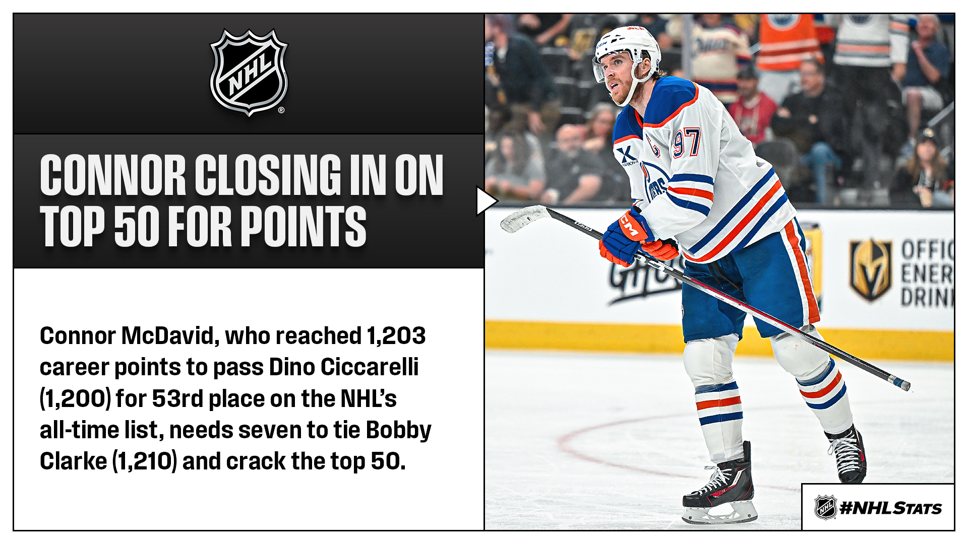 Connor McDavid reached the 800-assist milestone, added a goal and factored on the overtime winner as the Oilers (36-28-9, 81 points) opened a two-point lead on the Golden Knights (32-26-15, 79 points) for second place in the Pacific Division. McDavid (785 GP) became the third-fastest player in NHL history to 800 career helpers behind Wayne Gretzky (527 GP on Feb. 6, 1986) and Mario Lemieux (661 GP on March 26, 1996), the latter of whom hit the mark exactly 30 years before McDavid.