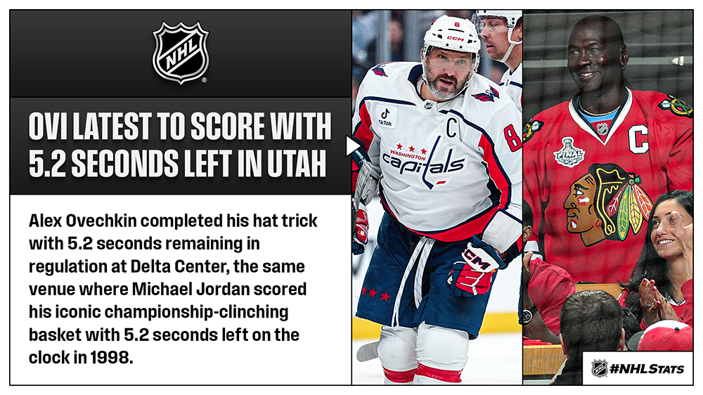 Alex Ovechkin tallied his third goal of the game with 5.2 seconds remaining in regulation to complete his 34th career hat trick and pass Brett Hull (33) for fourth place on the NHL’s all-time list. Wayne Gretzky (50), Mario Lemieux (40) and Mike Bossy (39) round out the top three.