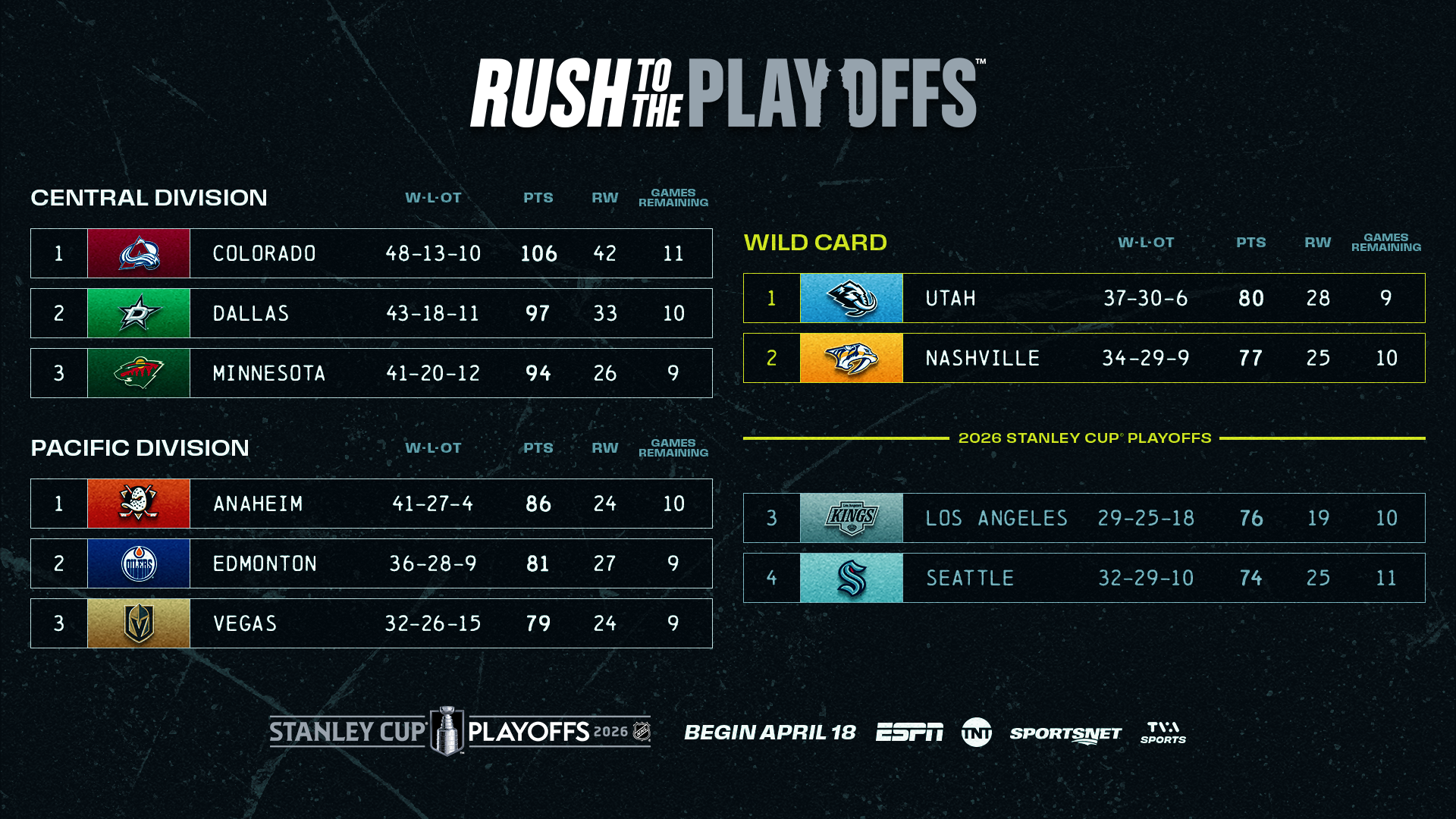 The Kings (29-25-18, 76 points) and Kraken (32-29-10, 74 points) earned wins to climb within one and three points, respectively, of the Predators (34-29-9, 77 points) – who occupy the Western Conference’s final Wild Card spot and fell to the Devils on Thursday.