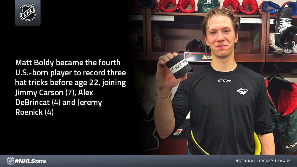 * Boldy (21 years, 356 days) scored his second hat trick this month and the third of his career – only Marian Gaborik (5) recorded more with the Wild at age 21 or younger.