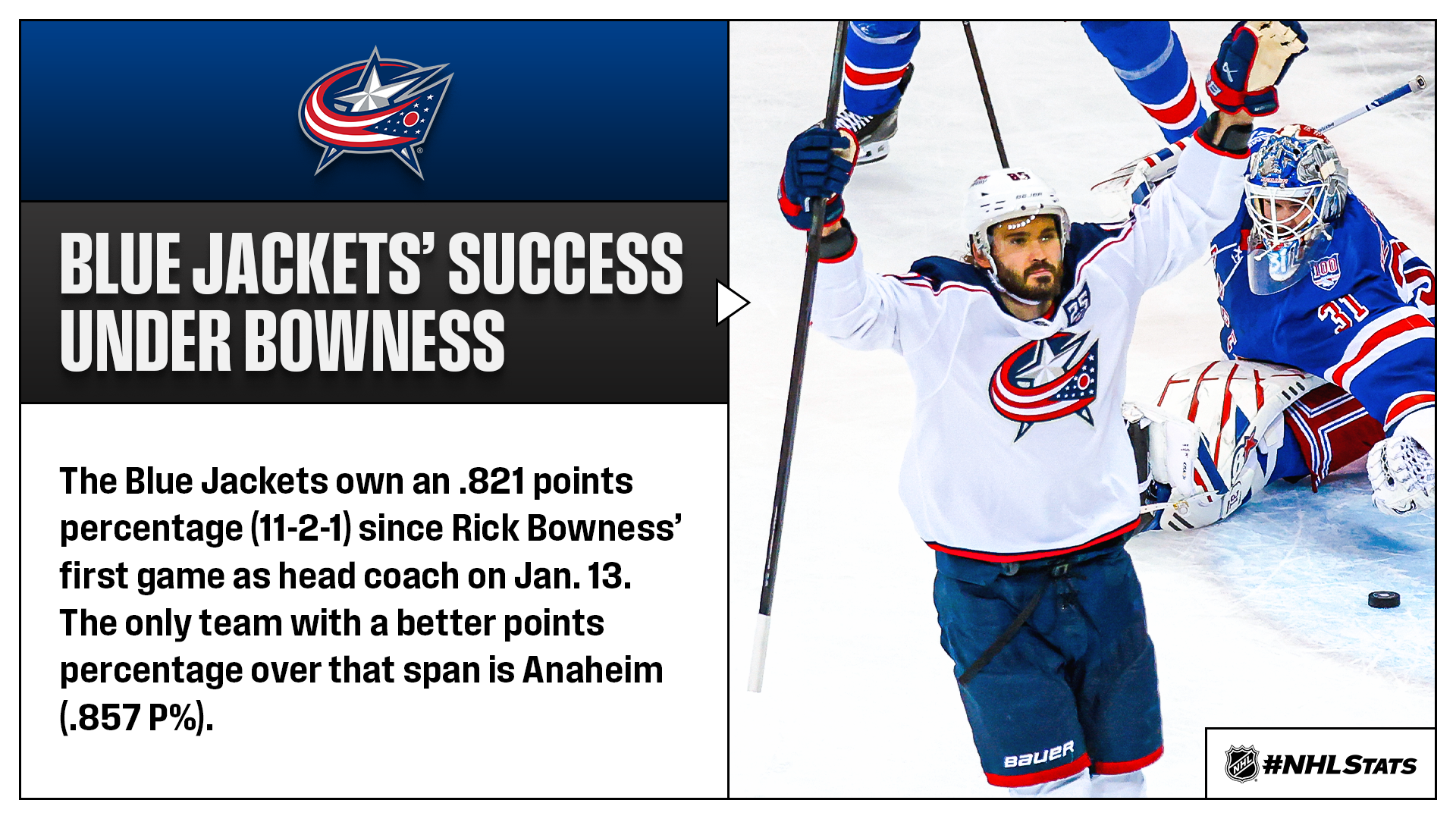 The Blue Jackets and Flyers each withstood third-period rallies to earn crucial wins and improve their positioning in the Eastern Conference Wild Card race. Columbus (30-21-8, 68 points) moved within three points of Boston (33-21-5, 71 points) for the second Wild Card spot in the East, while Philadelphia (28-21-11, 67 points) moved within four points of the playoff line.