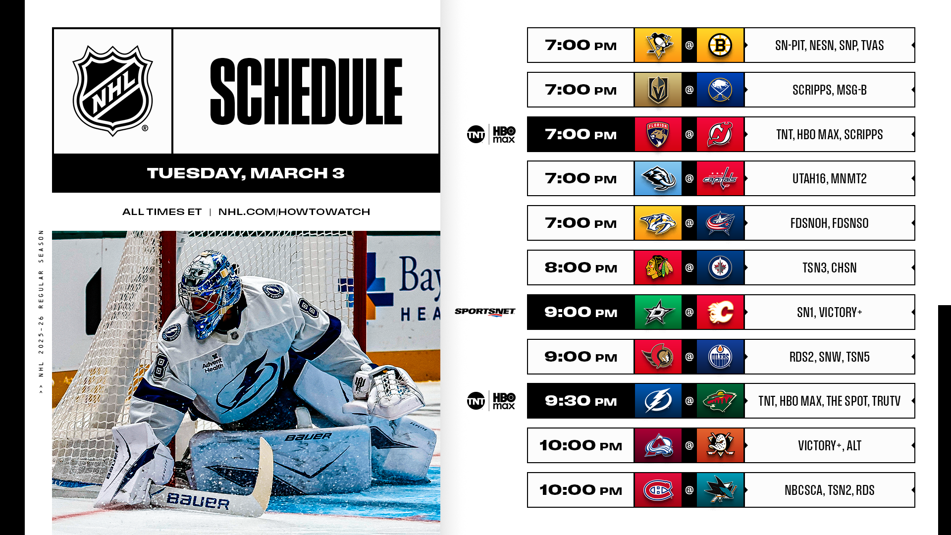 * Other key storylines heading into tonight’s 11-game slate are detailed in the March 3 edition of #NHLStats: Live Updates.