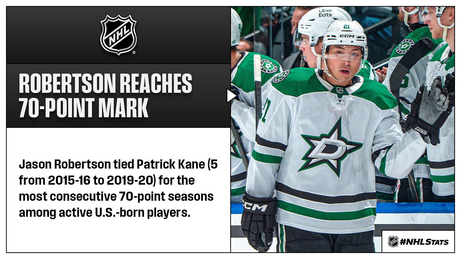 * Jason Robertson tied the longest streak of consecutive 70-point campaigns among active U.S.-born players as the Stars set a franchise record with their ninth straight win.