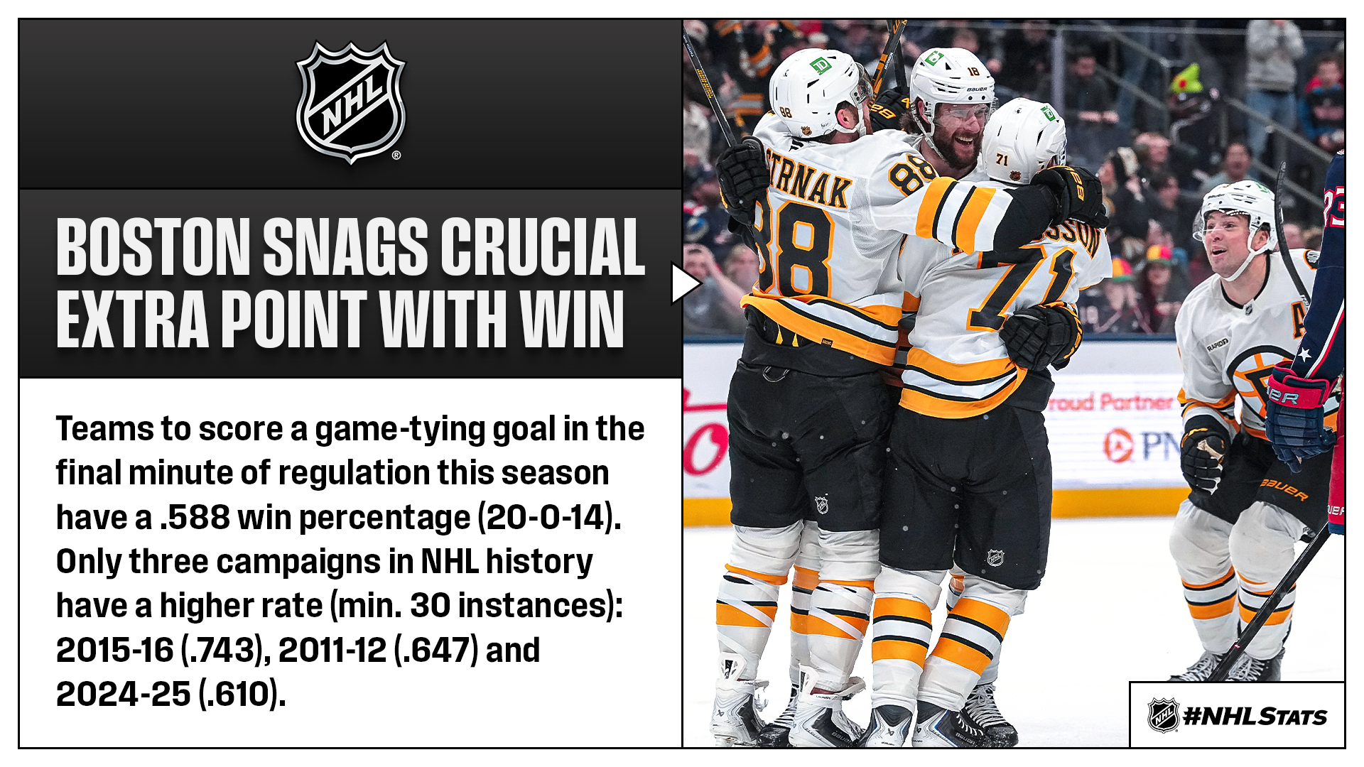 The Atlantic Division saw both the Bruins (42-24-8, 92 points) and Canadiens (42-21-10, 94 points) skate to comeback wins Sunday – with Boston doing so via a three-goal, third-period rally – to earn crucial standings points and continue their battle for a berth into the 2026 Stanley Cup Playoffs.