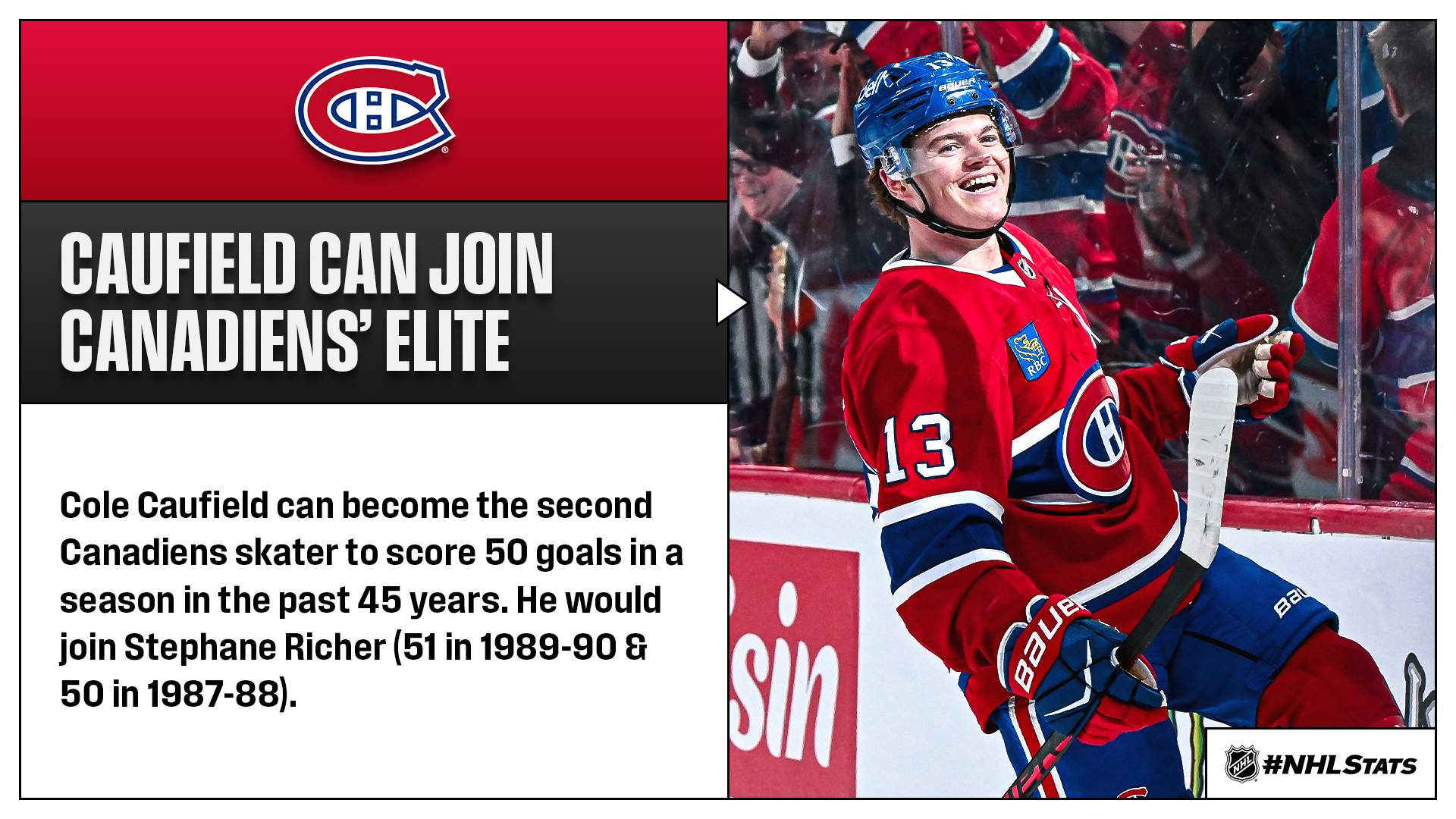5. Four-game slate set for Hockey Night in Canada (Saturday): Canadiens forward Cole Caufield (46) enters the week in hot pursuit of Nathan MacKinnon (48) for the League lead in goals and needs just four tallies to become the seventh player to record a 50-goal season with Montreal.