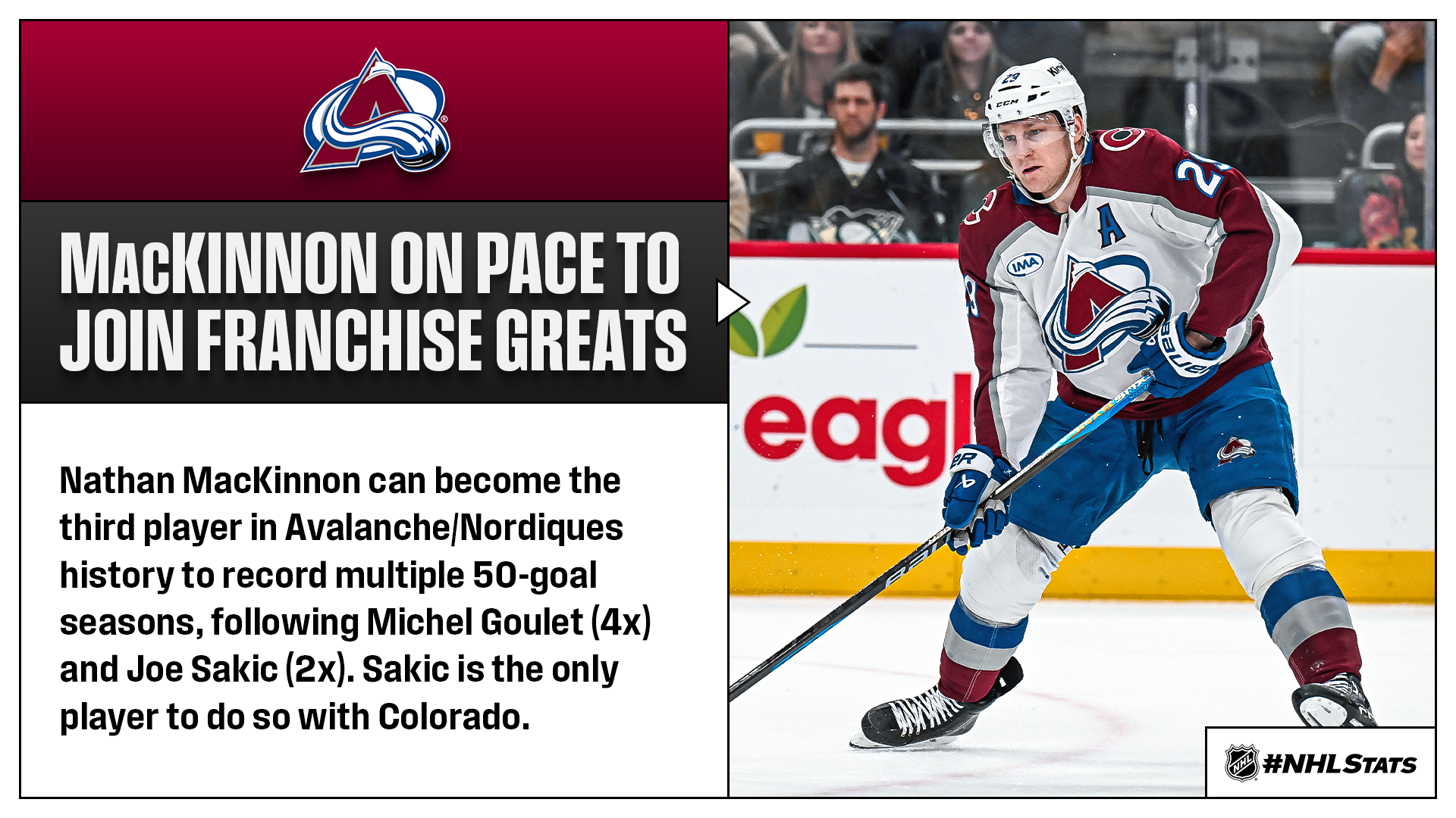 * MacKinnonhas an NHL-best 48 goals and aims to add a Maurice “Rocket” Richard Trophy to a display case that already includes a Stanley Cup, Hart Memorial Trophy, Ted Lindsay Award, Lady Byng Memorial Trophy and Calder Memorial Trophy. MacKinnon can become the second player in Avalanche/Nordiques history to finish a season as the NHL’s leading goal scorer following Milan Hejduk, who won the “Rocket” in 2002-03 with 50 goals.