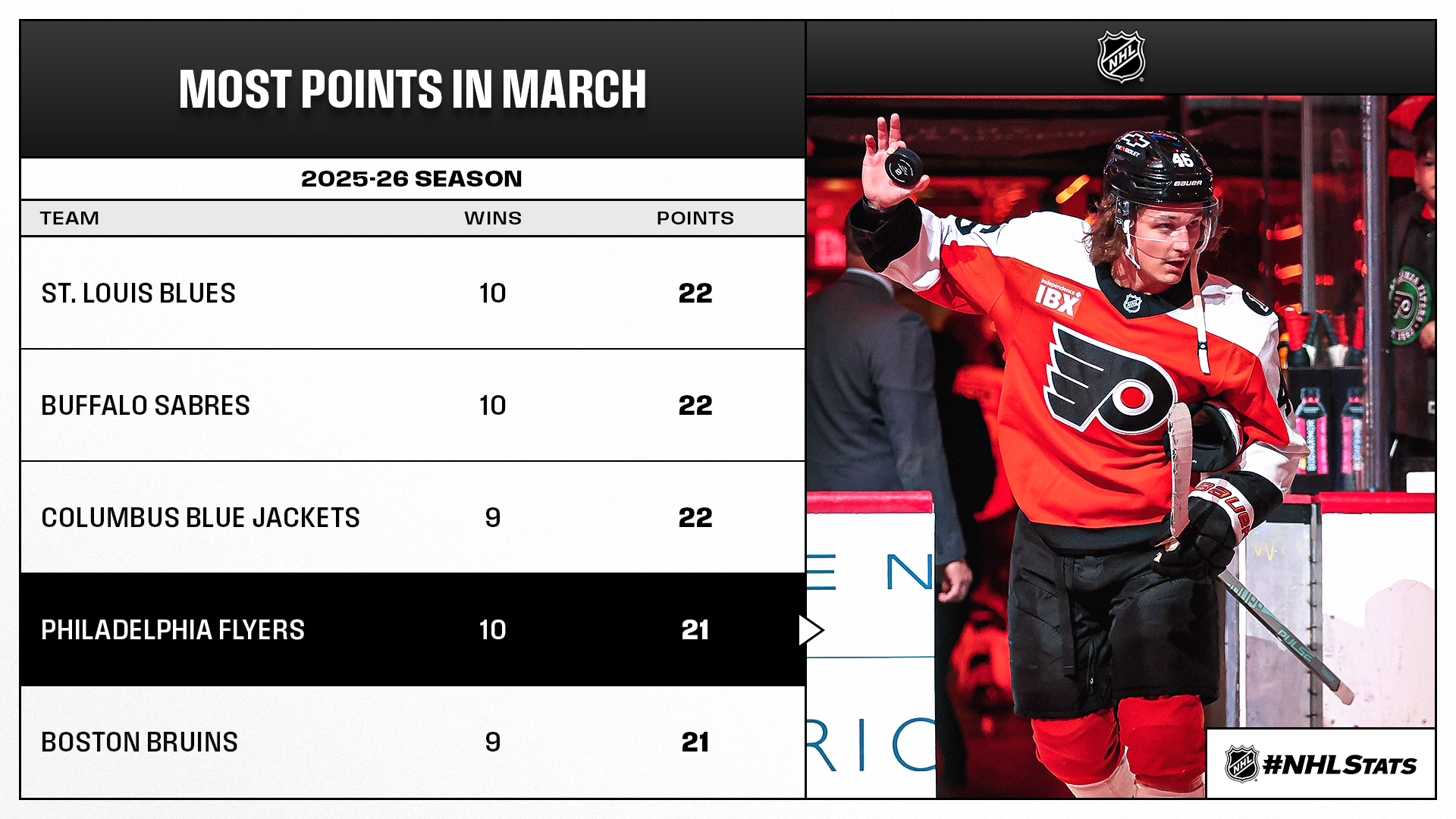 Trevor Zegras scored the overtime winner to push the Flyers (37-24-12, 86 points) within two points of the final Wild Card position, which is held by the Blue Jackets (38-24-12, 88 points). Philadelphia is one of the League’s top teams in March in terms of wins, points and points percentage (.750) – the third highest among all teams behind St. Louis (.846) and Buffalo (.786). The Flyers’ month of March has helped them move from six points out of a postseason position to two.