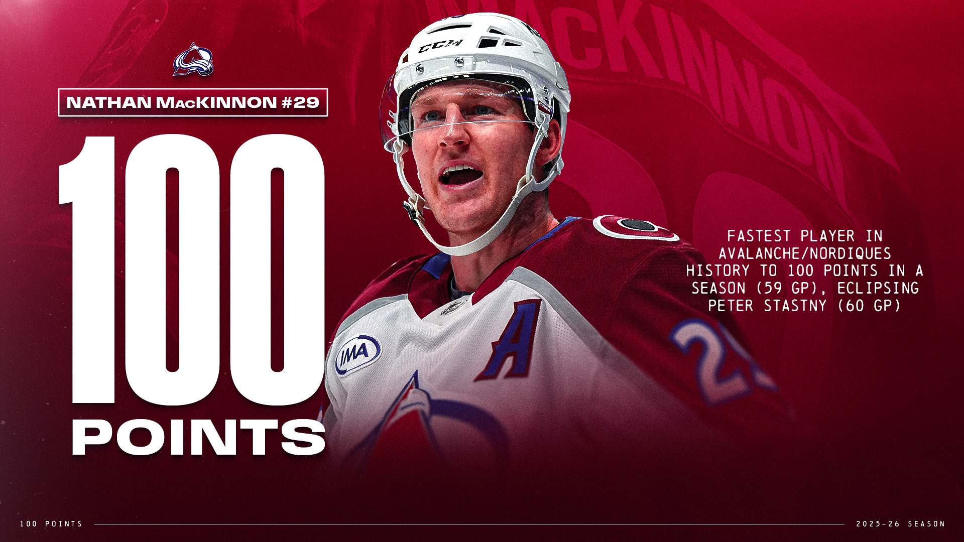 * MacKinnonbecame the fourth player in Avalanche/Nordiques history to record four or more seasons with 100 points, following Peter Stastny (7), Joe Sakic (6) and Michel Goulet (4). He also joined Stastny (6 from 1980-81 to 1985-86) as the only players to do so in four consecutive campaigns.