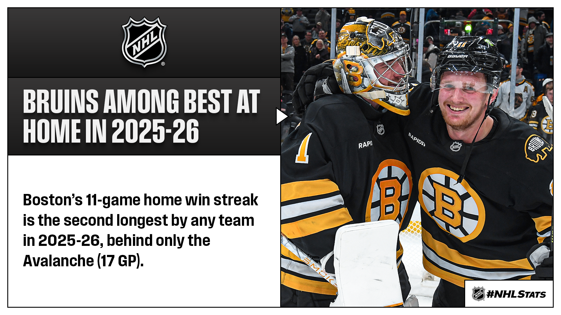 * The Bruins (34-21-5, 73 points) scored twice in a 50-second span in the first period and rode a 34-save performance from goaltender Jeremy Swayman to earn their 11th consecutive home win, tied for the eighth longest streak in franchise history and lengthiest by Boston since a 14-game run in 2022-23. The Bruins, who hold the second Wild Card position after missing the playoffs in 2024-25, improved to 23-8-1 on home ice, tied with the Hurricanes (23-8-2) for the most home wins this season.