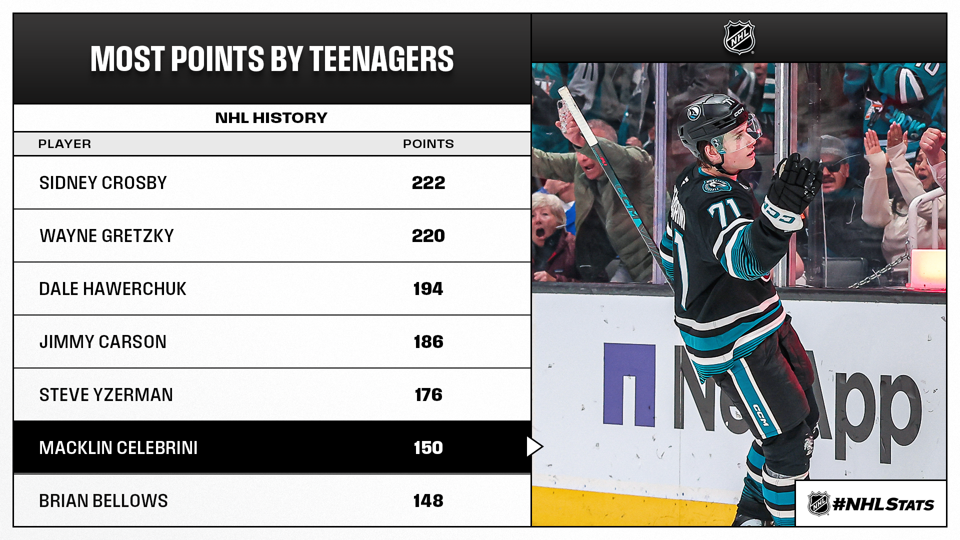 Macklin Celebrini (1-3—4) became the first teenager in Sharks history to score 30 goals in a season and became the third-fastest active player to reach the mark as a teenager (59 GP), behind Patrik Laine (55 GP in 2016-17) and Steven Stamkos (56 GP in 2009-10). Celebrini would end the contest with his fifth career four-point game, the fourth most by a teenager in NHL history behind Wayne Gretzky (14), Sidney Crosby (8) and Dale Hawerchuk (7). His fourth point of the night was the 150th of his career – he required the fourth-fewest games among active players (129 GP) to reach that mark, behind Crosby (109 GP), Alex Ovechkin (114 GP) and Connor McDavid (128 GP).