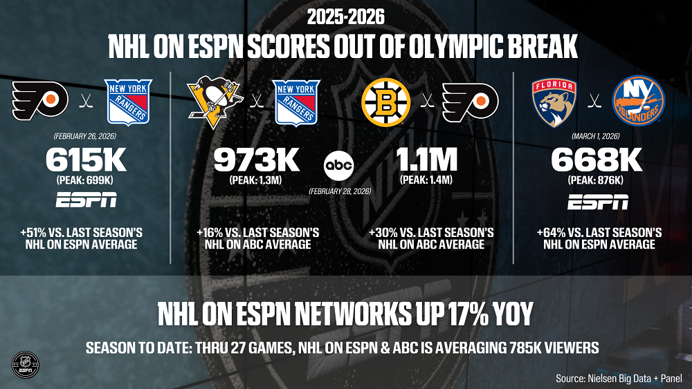 NHL on ESPN, ABC score out of Olympic break