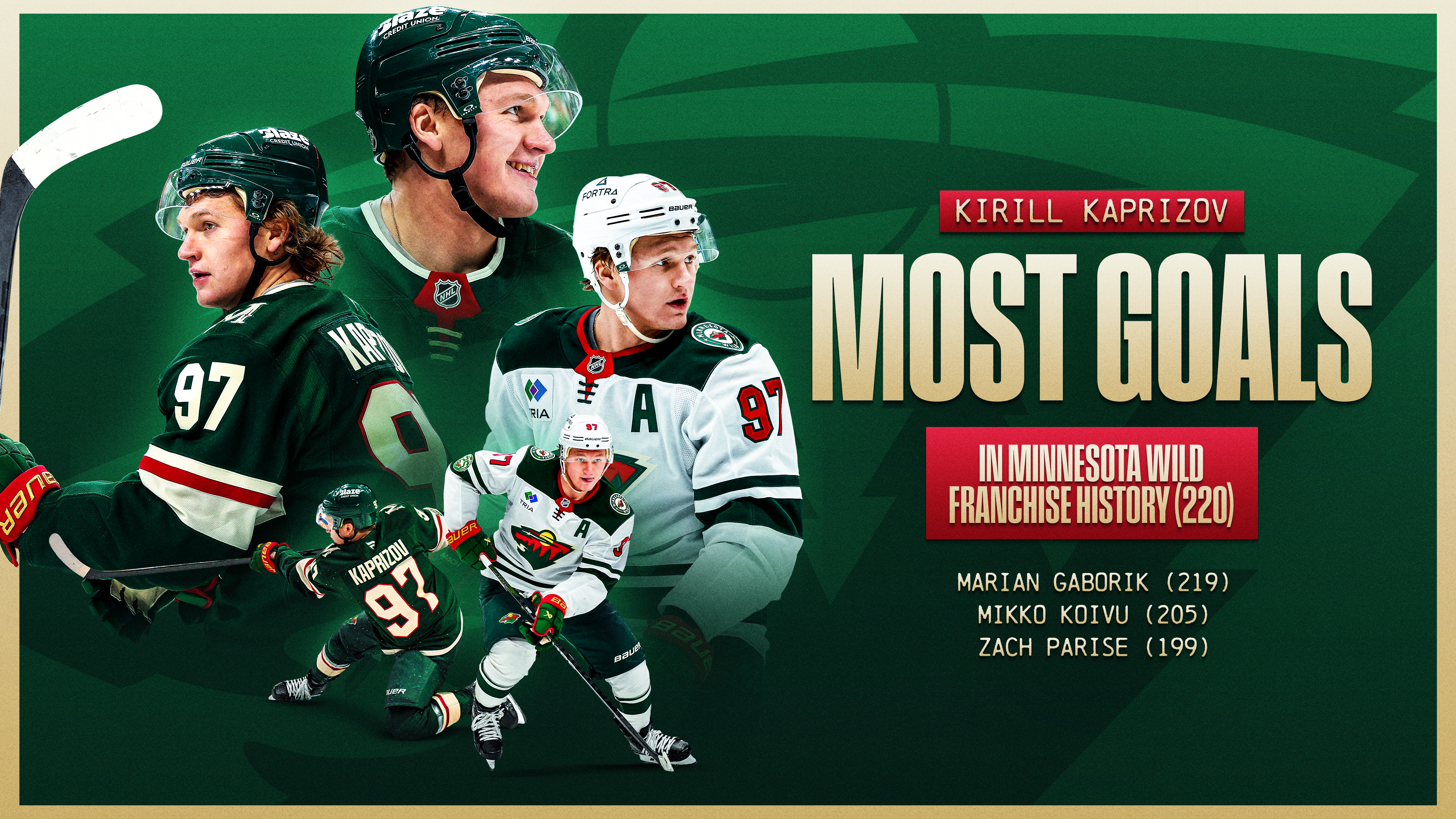 Kirill Kaprizov scored his 220th career goal and surpassed Marian Gaborik (219) to establish the franchise record en route to a Wild victory over the Atlantic Division-leading Lightning. Kaprizov is one of just eight players born and trained outside of North America currently leading a franchise in goals. The others: Teemu Selanne (ANA), Aleksander Barkov (FLA), Filip Forsberg (NSH), Patrik Elias (NJD), Daniel Alfredsson (OTT), Daniel Sedin (VAN) and Alex Ovechkin (WSH).