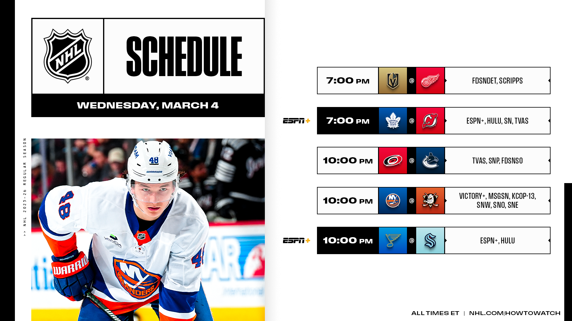 A five-game slate on Wednesday includes two high-scoring No. 1 picks facing off on ESPN+, Sportsnet and TVA Sports when Auston Matthews and the Maple Leafs visit Jack Hughes and the Devils, the Kraken continuing their push to return to the playoffs when they host the Blues on ESPN+ and a showdown between two Calder Trophy contenders when Matthew Schaefer and the Islanders visit Beckett Sennecke and the Ducks.