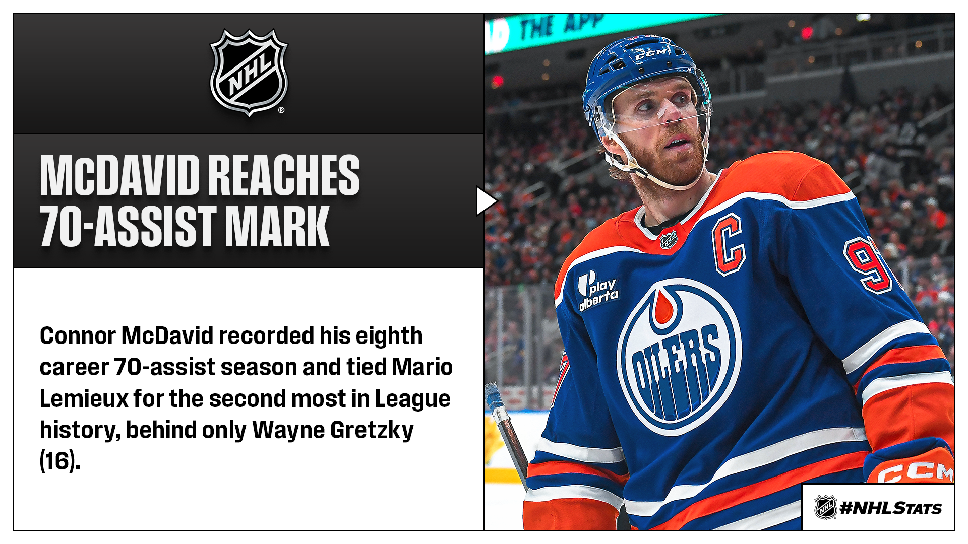* McDavid’s assist on the overtime goal was his League-leading 70th of 2025-26 – the sixth straight season he’s reached that mark. The only two players in NHL history with a run of that length are Gretzky (13 from 1979-80 – 1991-92) and Bobby Orr (6 from 1969-70 – 1974-75). The Oilers (30-24-8, 68 points) earned their fourth multi-goal, third-period comeback win of the season and tied the Ducks (33-24-3, 69 points) for the most among all teams. Edmonton leapfrogged Seattle (29-22-9, 67 points) for third in the Pacific Division, where the top four teams are within three points of one another.