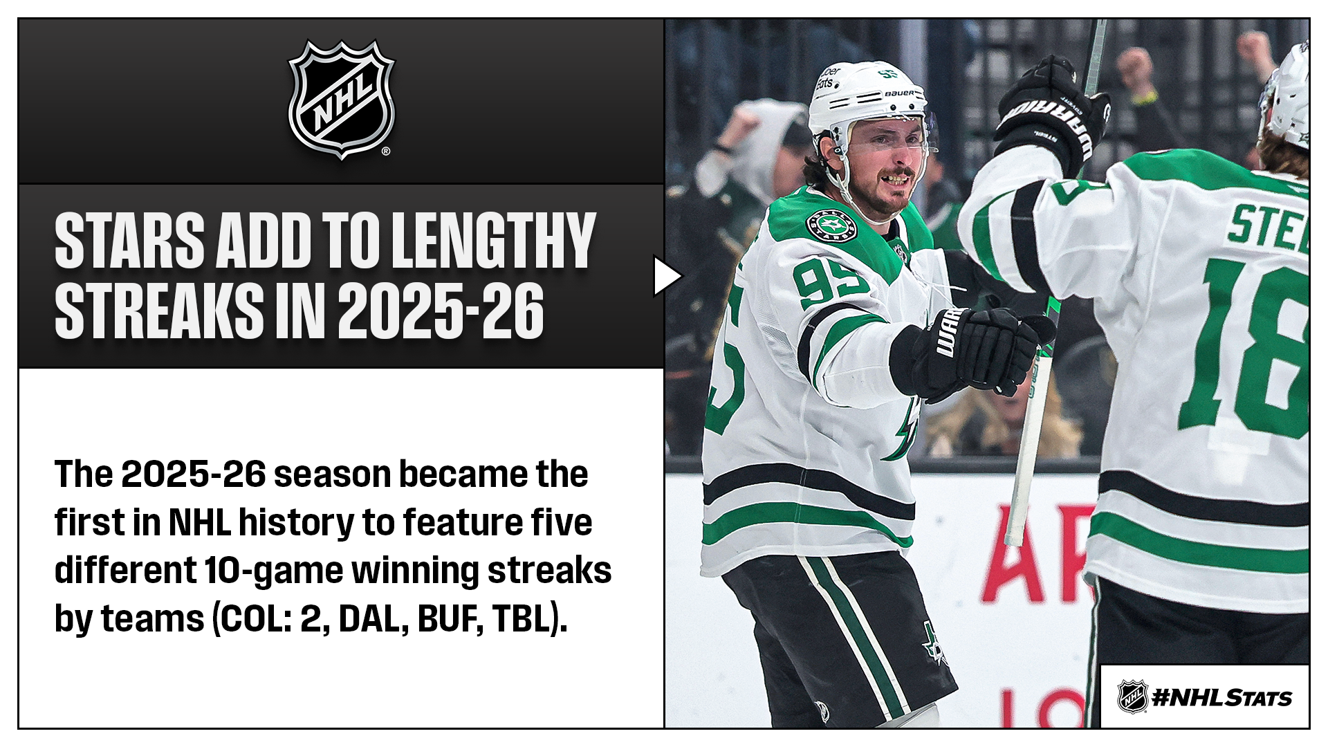 * Matt Duchene (0-4—4) recorded his first career four-assist game in the Stars’ 10th straight win as they improved to 38-14-9 (85 points) and kept pace with the Avalanche (41-10-9, 91 points) atop the Central Division. Dallas also became the first team to win 20 road games this season, a feat it has achieved twice before in 1997-98 and 1996-97. The Stars became the fourth different team (also COL: 2x, TBL & BUF) with a double-digit winning streak in 2025-26 – tied with 2021-22 (FLA, CGY, COL & PIT) and 2016-17 (CBJ, MIN, CGY & PHI) for the most in a single season in NHL history.