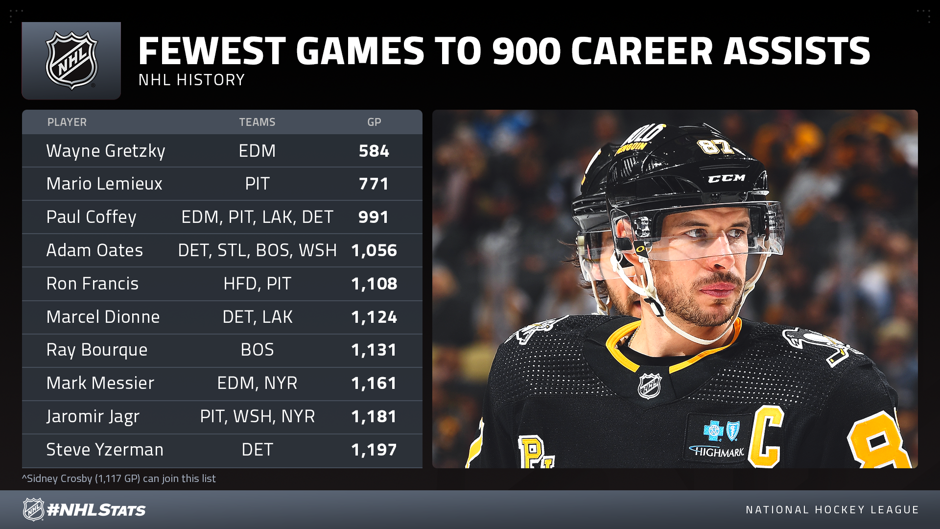 * Crosby (521-899—1,420 in 1,117 GP), who has 4-7—11 in nine games this season, needs one helper to become the 20th player in NHL history to reach 900 and first since Joe Thornton with the Sharks on March 19, 2015. Crosby also enters Tuesday just one point back of passing Adam Oates (341-1,079—1,420 in 1,337 GP) for sole possession of 18th place on the League’s all-time list.