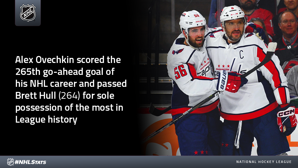 * Capitals captain Alex Ovechkin scored from a familiar spot to reach 785 goals in his NHL career. He moved within one of tying Gordie Howe (786 G w/ DET) for the most by a player with one franchise in NHL history.