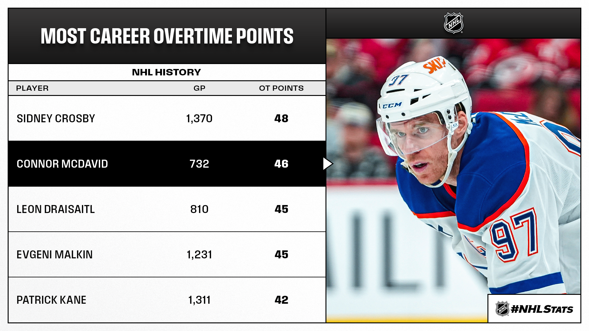 * Draisaitl scored his 20th career overtime goal and surpassed John Tavares and Jaromir Jagr for the fourth most in NHL history. It also marked his 73rd career game-winning goal, breaking a three-way tie with McDavid and Glenn Anderson for the most in Oilers history.