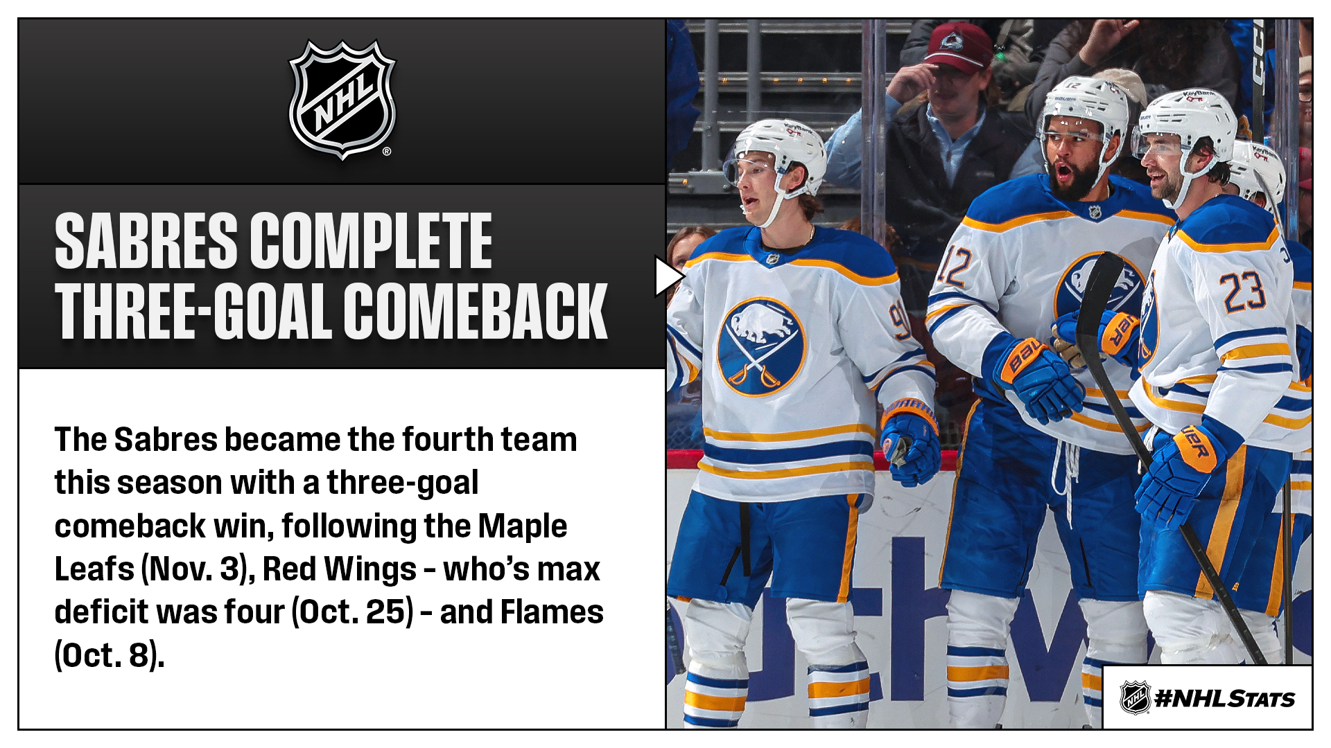 SABRES COMPLETE LEAGUE’S FOURTH THREE-GOAL COMEBACK WIN THIS SEASON