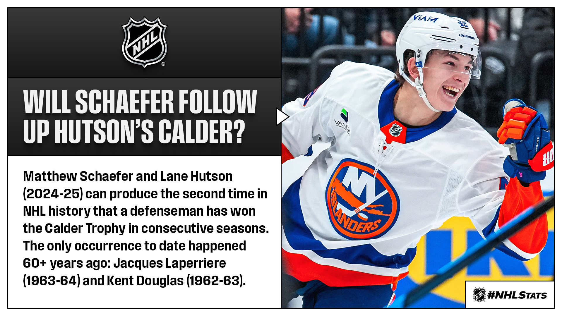 * A compelling Calder Trophy race has goaltender Jesper Wallstedt (6-0-2, .935 SV%, 1.94 GAA), defenseman Matthew Schaefer (7-8—15) as well as forwards Ivan Demidov (4-13—17) and Beckett Sennecke (7-9—16) all contributing to their team’s success in 2025-26. Wallstedt has yet to record a regulation loss this season and paces the League with three shutouts while the three aforementioned skaters all rank within the top five in scoring for their respective teams, with Schaefer also tied for the third-most goals among all defensemen. The No. 1 pick from 2025 NHL Draft can become the fourth blueliner in the League’s expansion era (since 1967-68) to finish a campaign as the rookie scoring leader, following Brian Leetch (71 in 1988-89), Quinn Hughes (53 in 2019-20) and last season’s Calder Trophy winner Lane Hutson (66 in 2024-25).