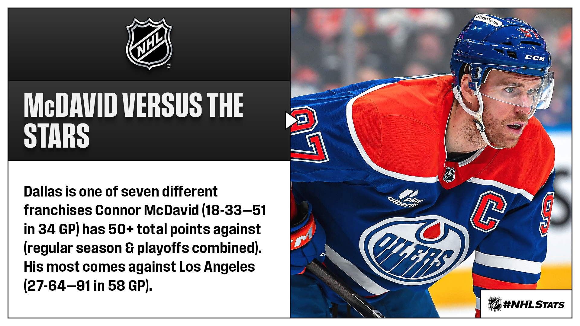 * McDavid, who is coming off hitting the 1,100-point milestone, will face a Dallas team he recorded nine points against in the 2025 Conference Finals, which included the series-clinching goal in Game 5. The Oilers captain has posted a point against the Stars in 11 straight games (regular season & playoffs) dating to Game 3 of the 2024 Conference Finals.