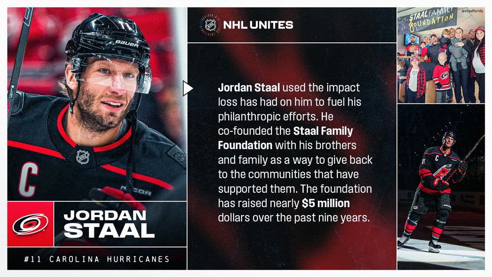 Jordan Staal is an NHL veteran who continues to use his platform to make a difference in the community – his impact highlighted during the month of November, which is a League-wide celebration month for Hockey Fights Cancer. Jordan and his brothers founded the Staal Family Foundation in 2012 and have raised over $5 million to support children who are fighting cancer and their families. The inspiration came from the sister of Eric‘s wife TanyaTamara Stephenson, who died in in 2010 following a lengthy battle with a rare form of liver cancer.