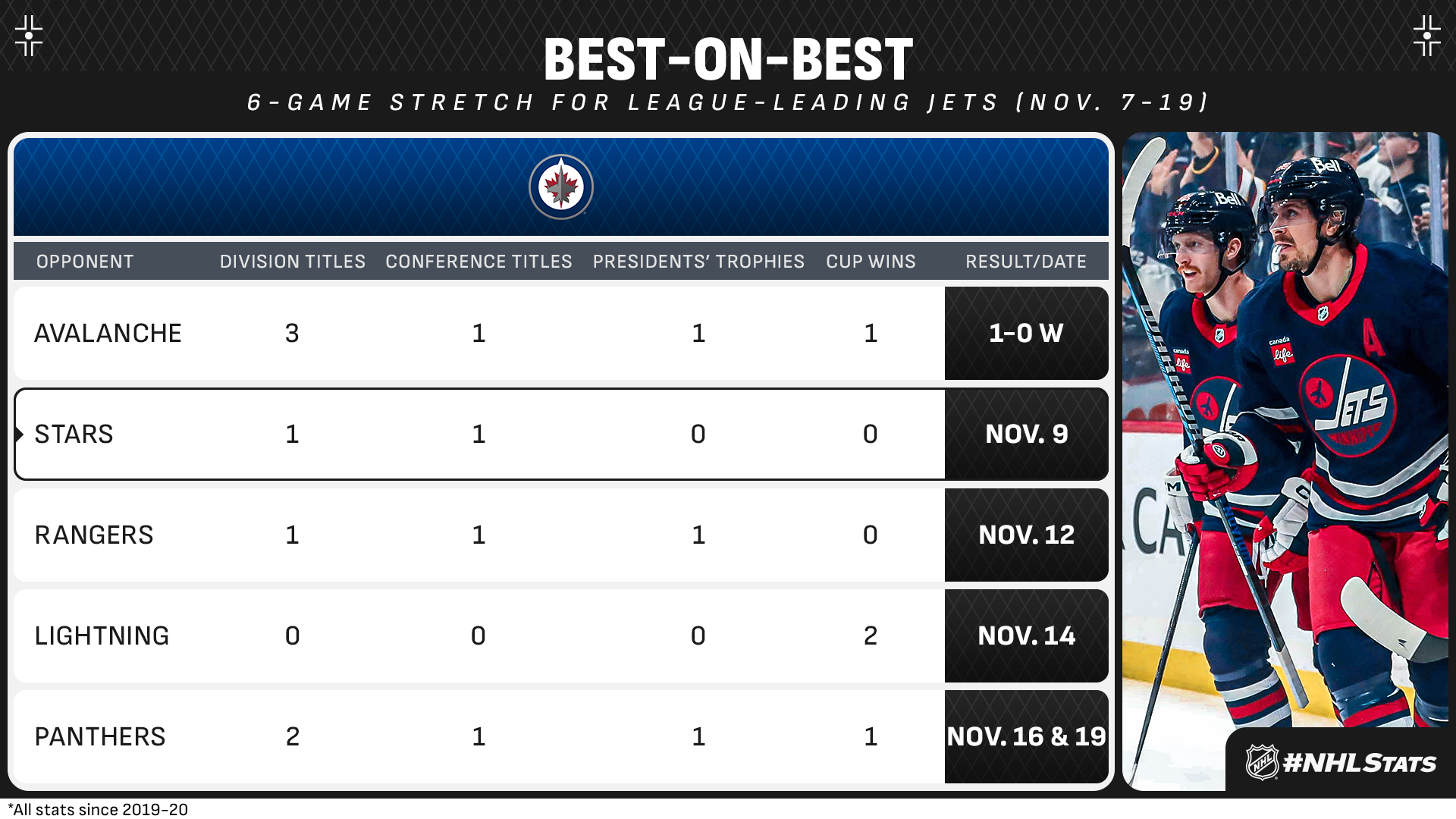 * Winnipeg will close out its four-game homestand against the Stars, the top team in the Western Conference last season and a club they battled down to the final six days of 2023-24 for both the conference and Central Division titles. This is part of a stretch that will see Winnipeg play six straight games against teams that have combined for four Stanley Cup wins, three Presidents’ Trophies, four conference titles and seven division titles. All games are available out of market on ESPN+ and Sportsnet+.