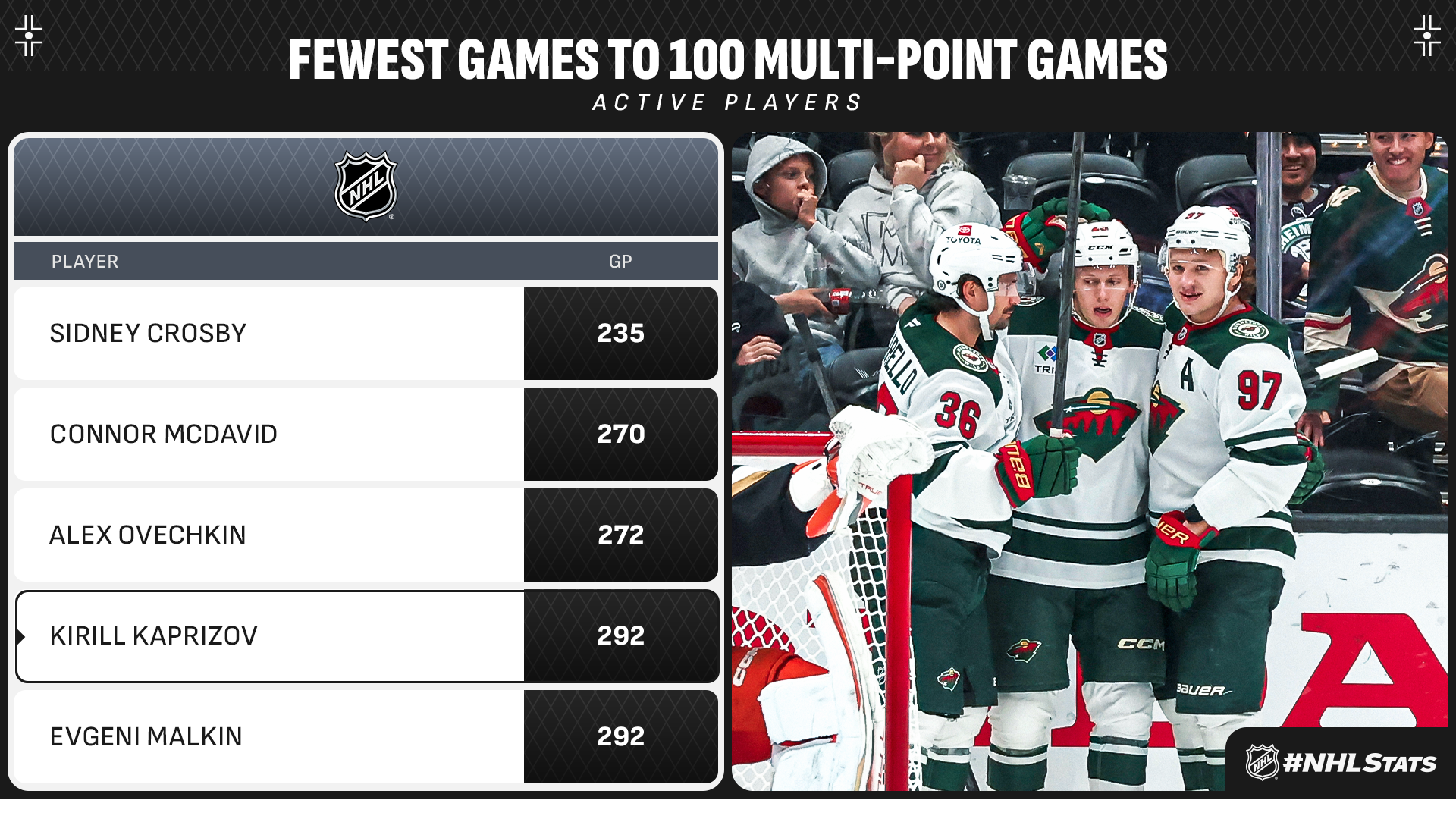 * He also joined Mikko Koivu (153) and Marian Gaborik (114) as the third player in franchise history with 100 multi-point performances and became the fastest among the three to reach the mark.