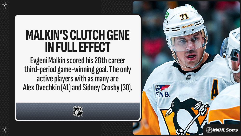 * Malkin scored his 32nd career go-ahead goal in the third period – the most in Penguins history. Of those 32, 15 were scored in the final 10 minutes of regulation. The only active players with as many such go-ahead tallies are Steven Stamkos (18), Ovechkin (16) and Crosby (15).