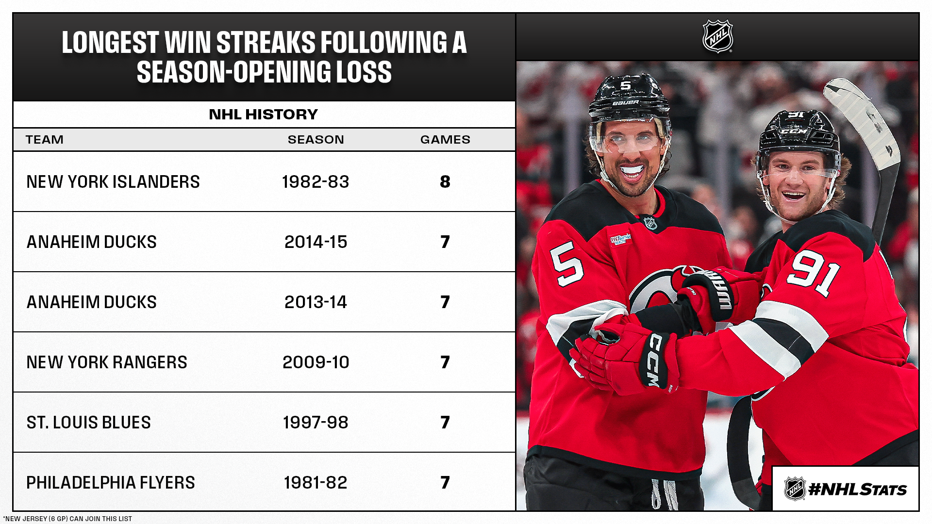 * New Jersey’s string of consecutive victories come on the heels of a season-opening loss; the longest win streak immediately following a season-opening loss is held by the 1982-83 Islanders (8-0-0 from Oct. 7-23, 1982).